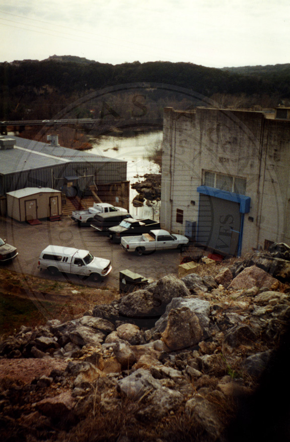Building on lake with trucks parked out side |