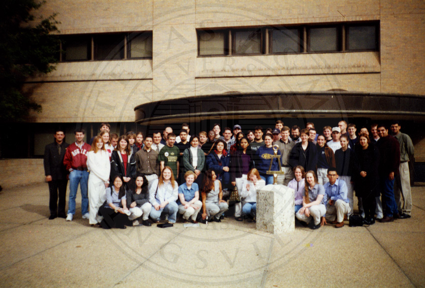 Group photo with the Tau Beta Pi crest in front of the unknown students |