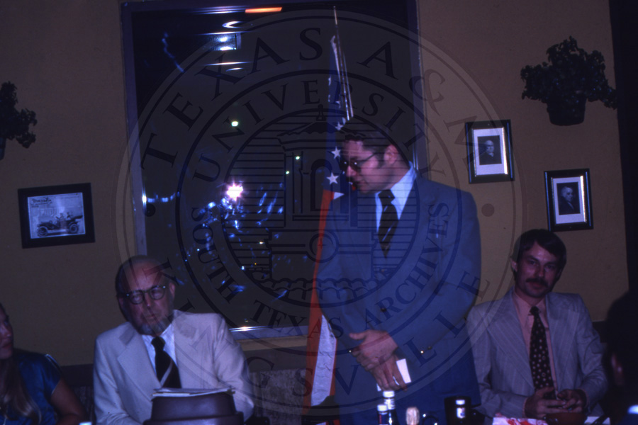 Slide H. Three unknown men in suits. One is standing and the others are flanking them at a table |