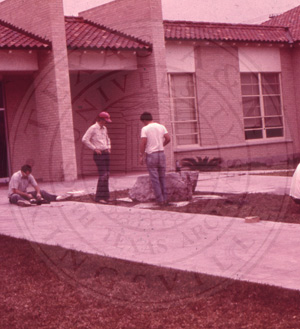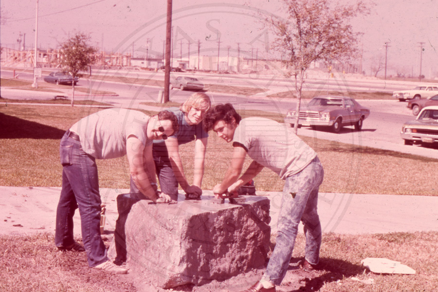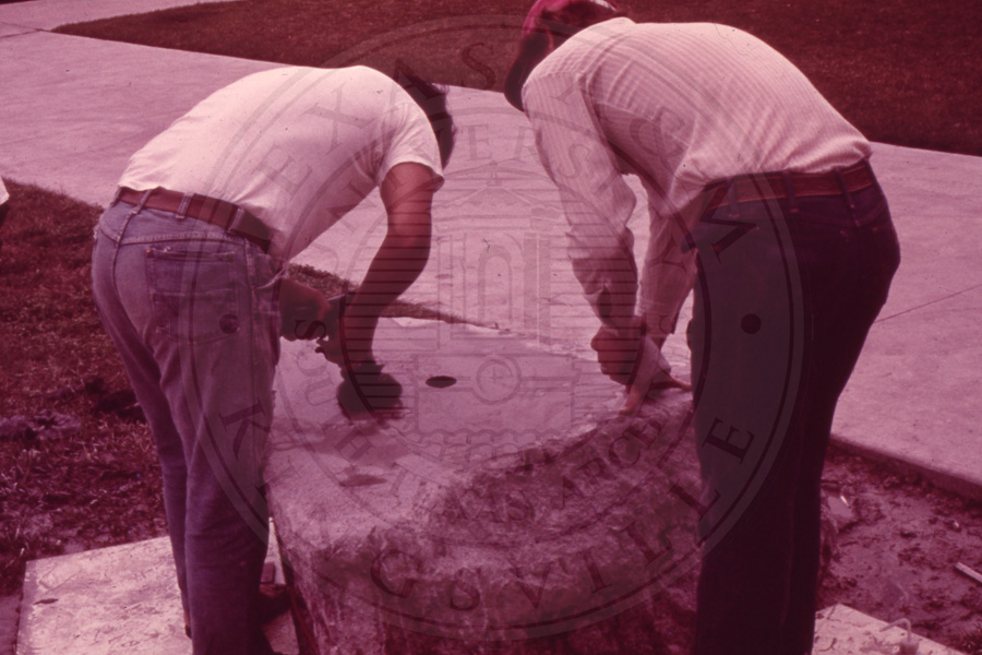 Slide 7. Three unknown students working on the stone base of the crest |