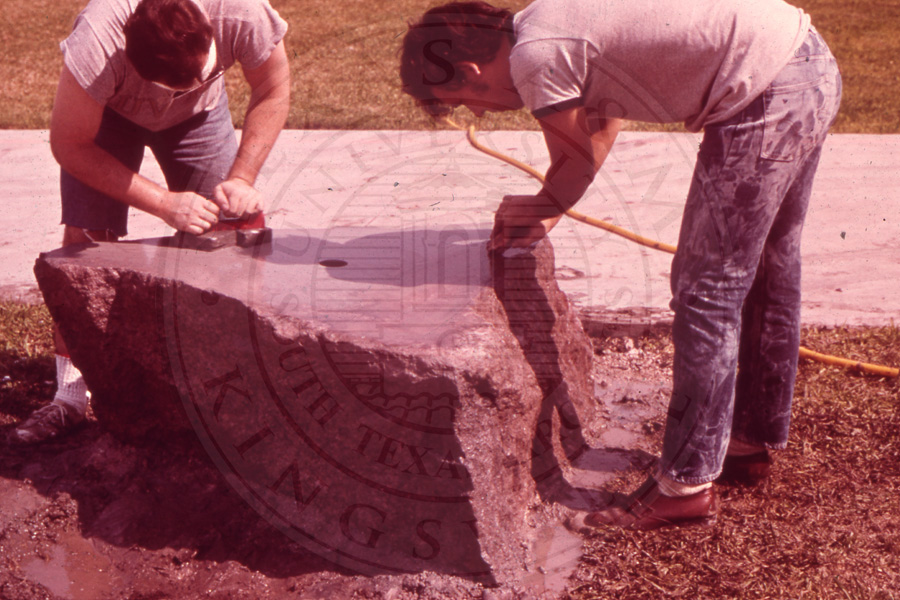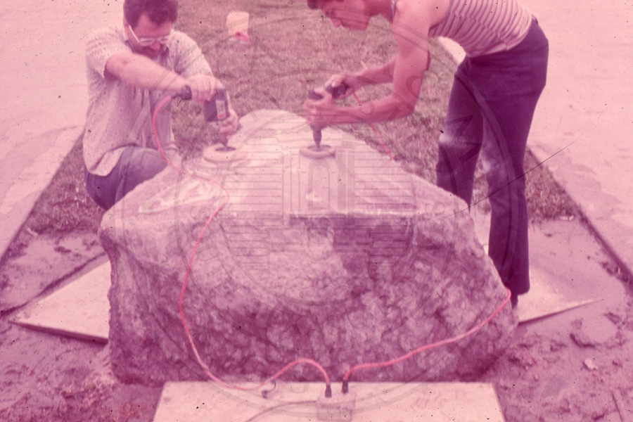 Slide 17. Two unknown students working on the stone base of the crest |
