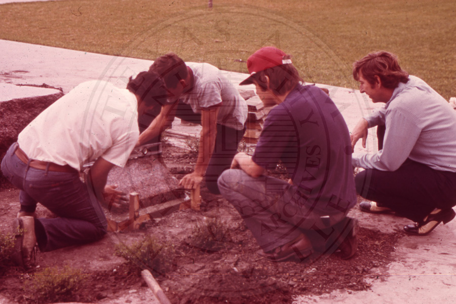 Slide 32. Four unknown students working on the platform for the stone base |