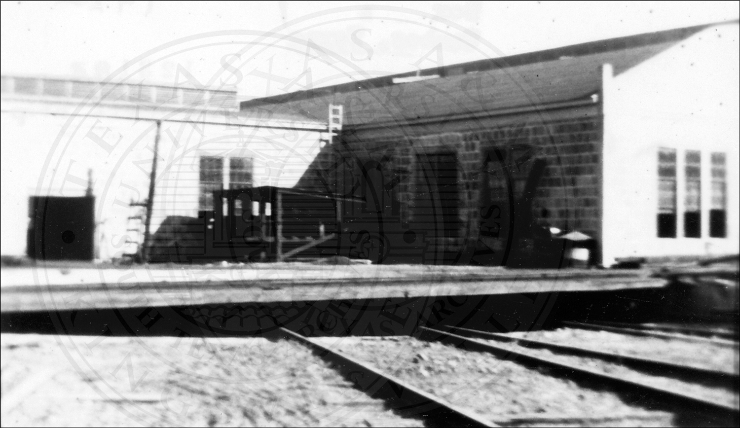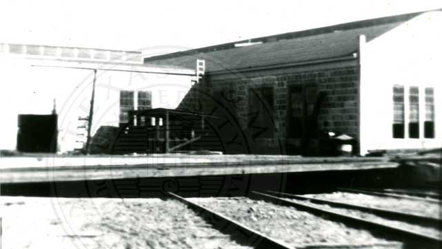 Close view of Master Mech office - Round House Back Shop - Car shop + track leading to same" |