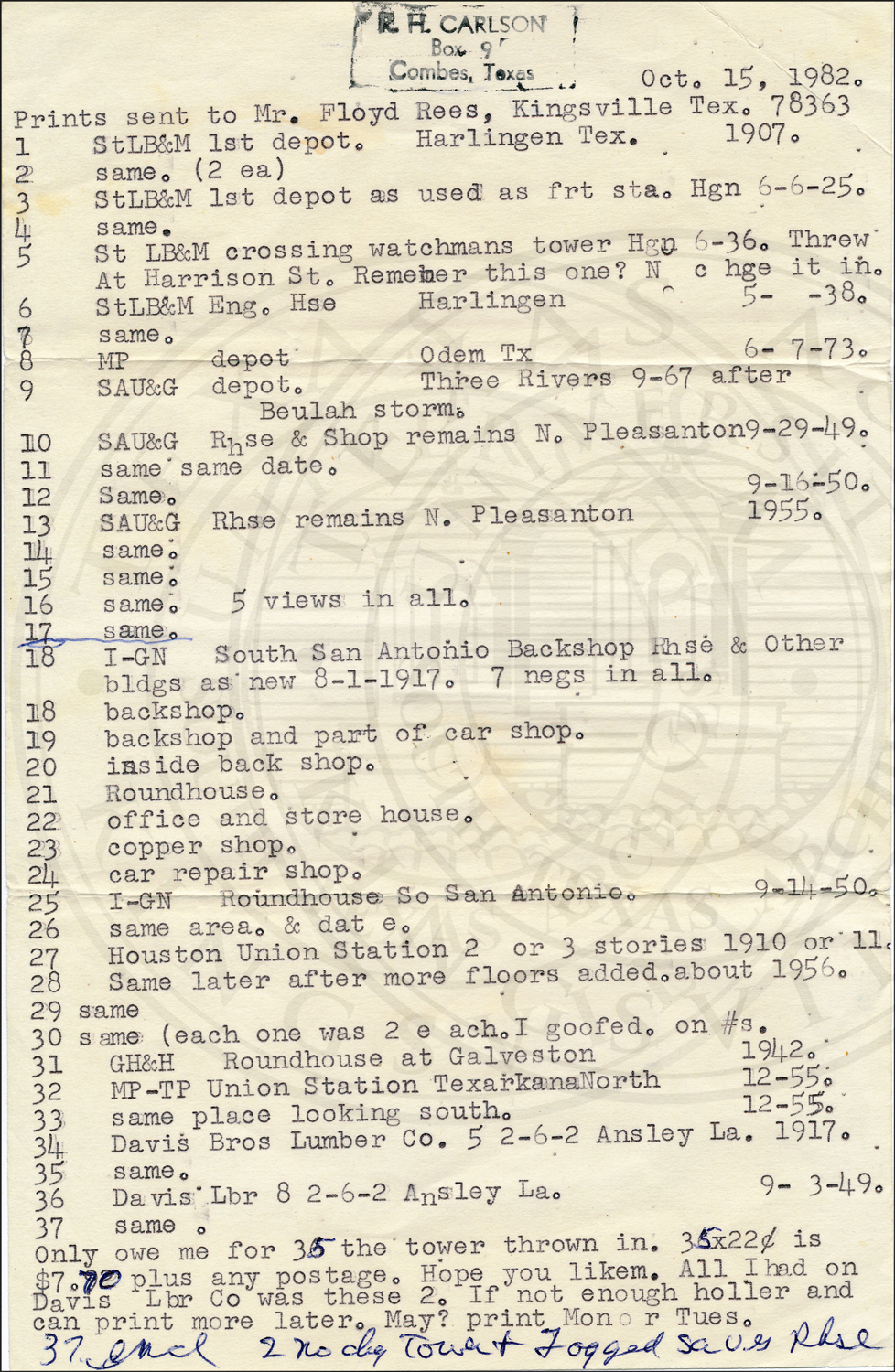"R. H. CARLSON Box 9 Combes, Texas" |