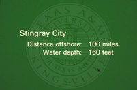 Sting Ray City Part I, Stingray City, Distance offshore: 100 miles; Water depth: 160 feet. |