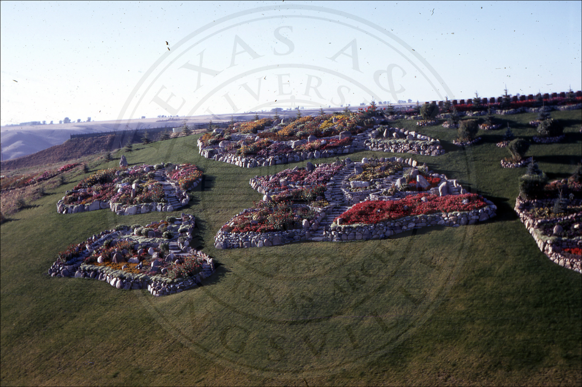 Grounds outside Lethbridge, Alberta, showing landscaping for Lethbridge Jubilee, 1955.
