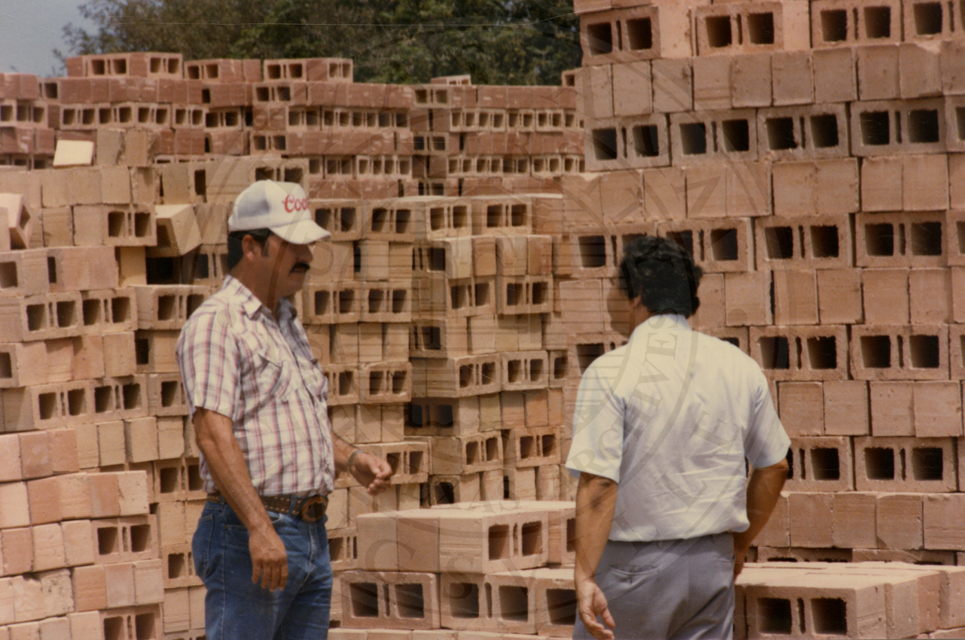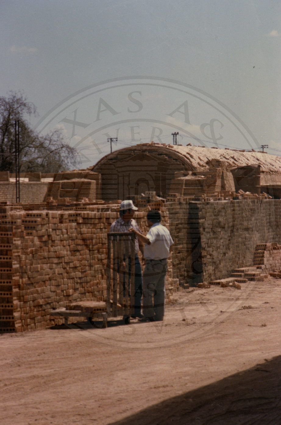 Two unidentified men standing and talking next to several piles of bricks at Camargo Brick |