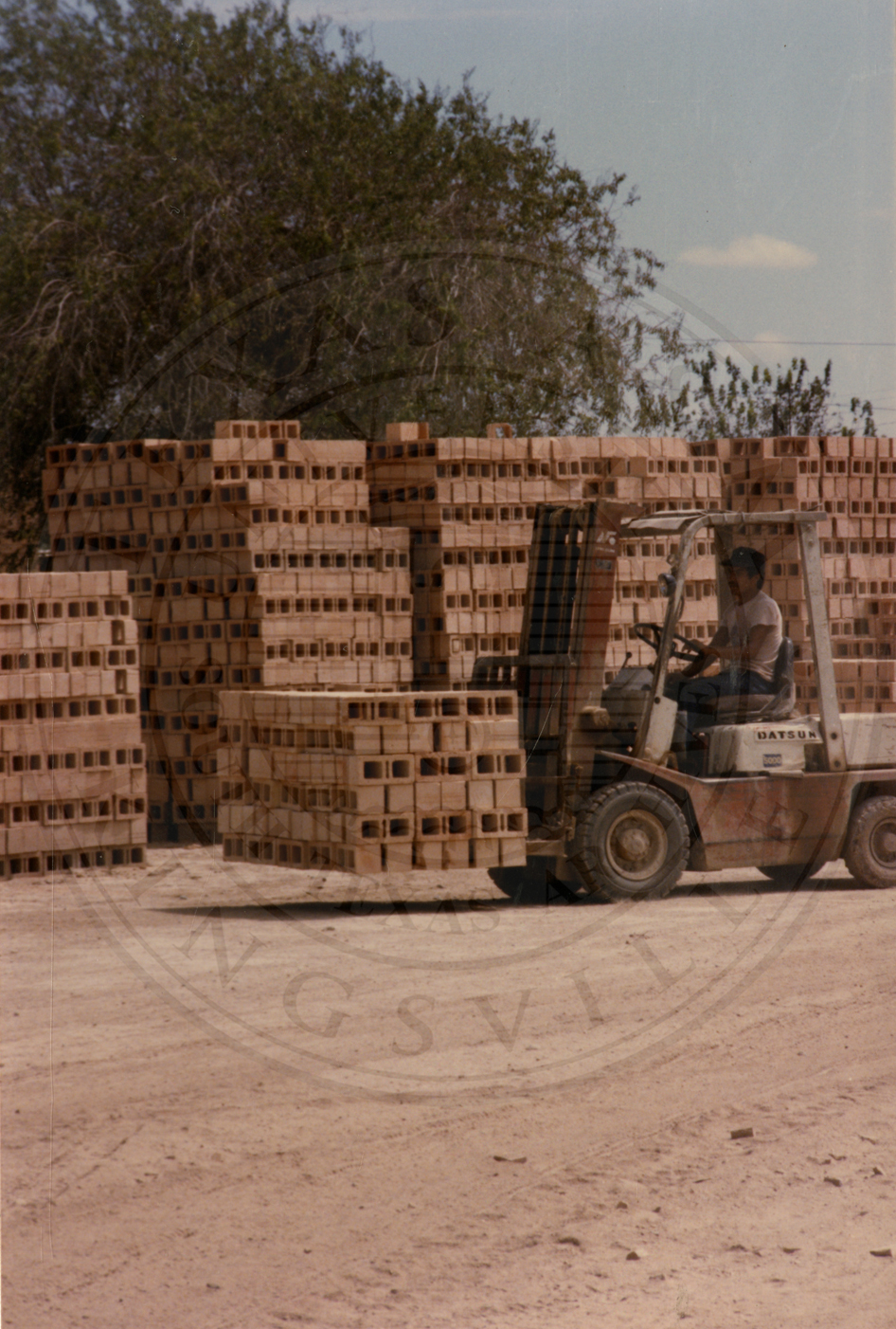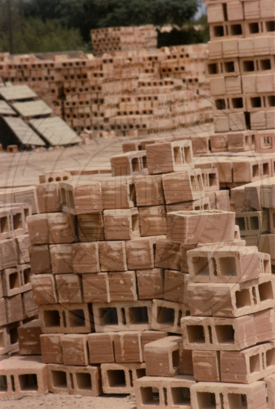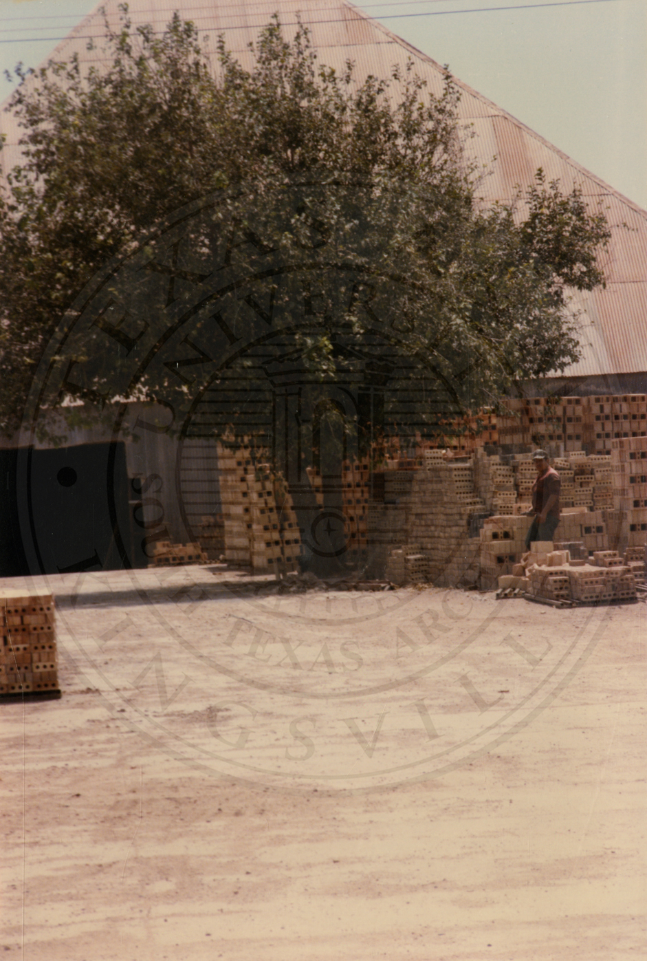 Several piles of cinder blocks at Camargo Brick with an unidentified man standing among them, under a tree |