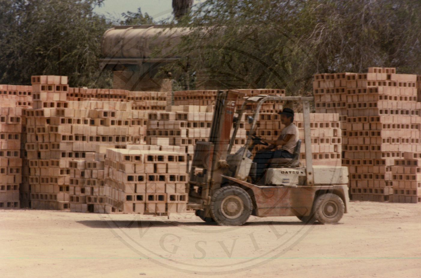 Several piles of cinder blocks with a pallet on a forklift, unidentified man driving the forklift |