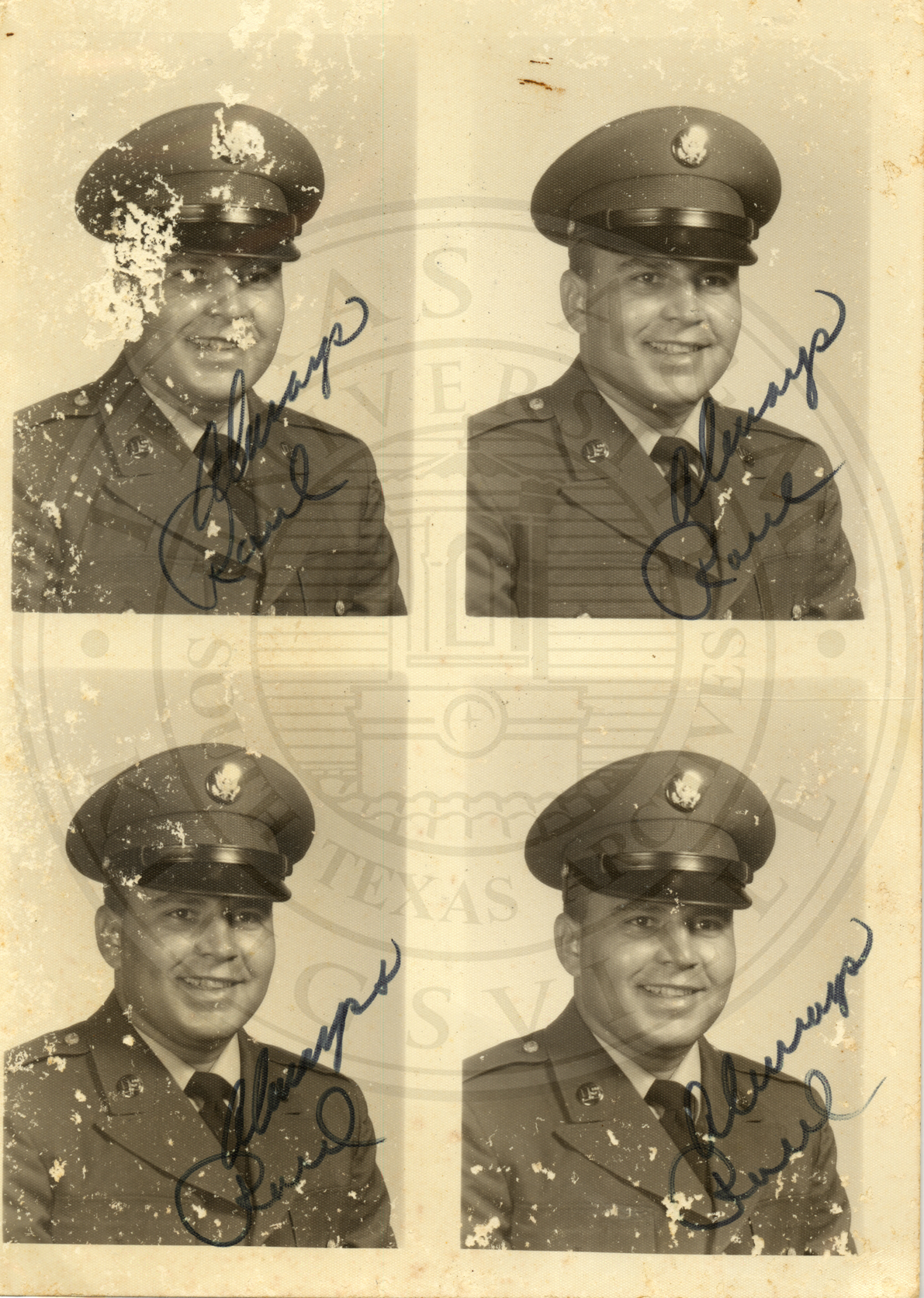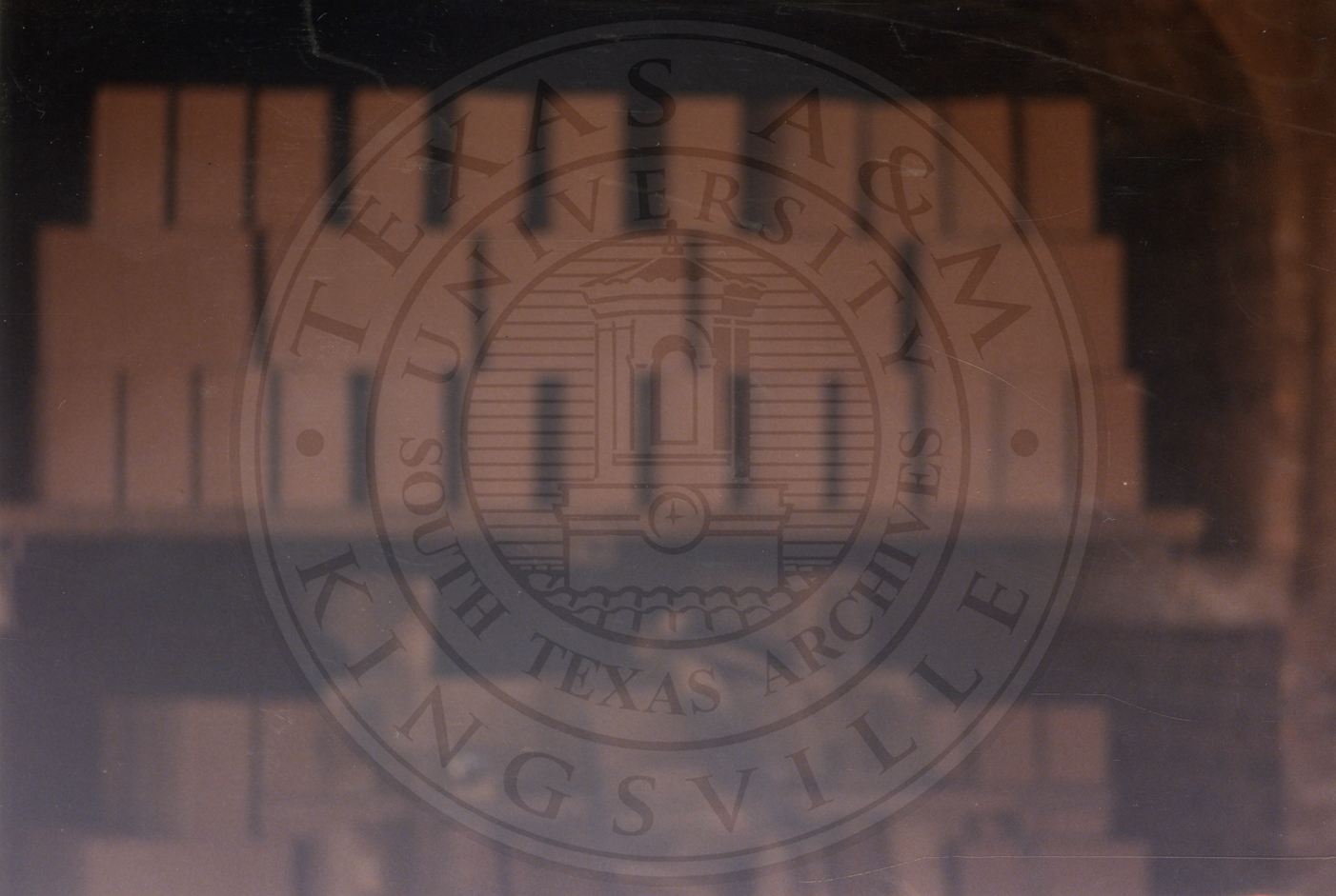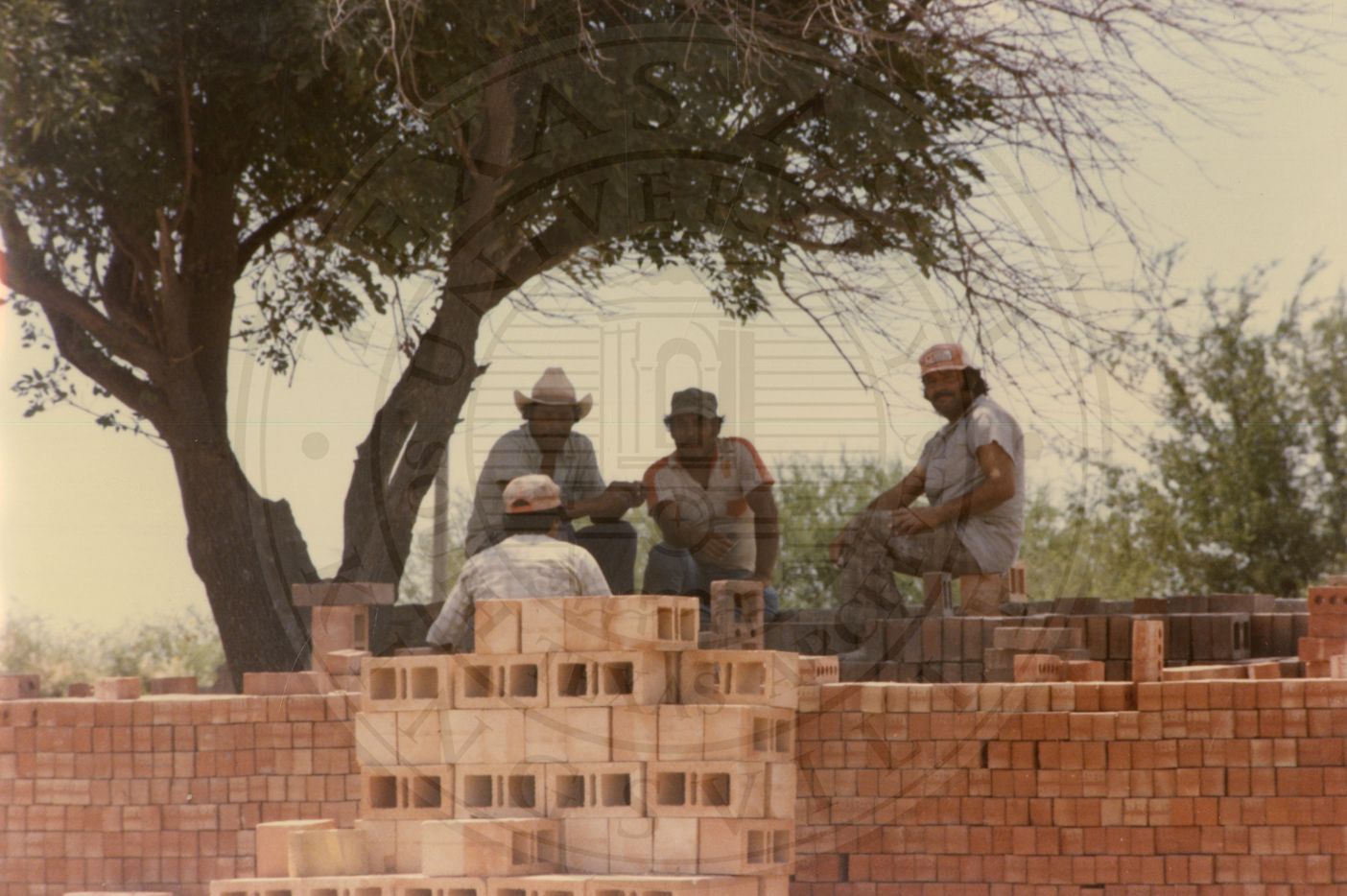 Several piles of cinder blocks at Camargo Brick. Four unidentified men seated on the top of cinder blocks under a tree |
