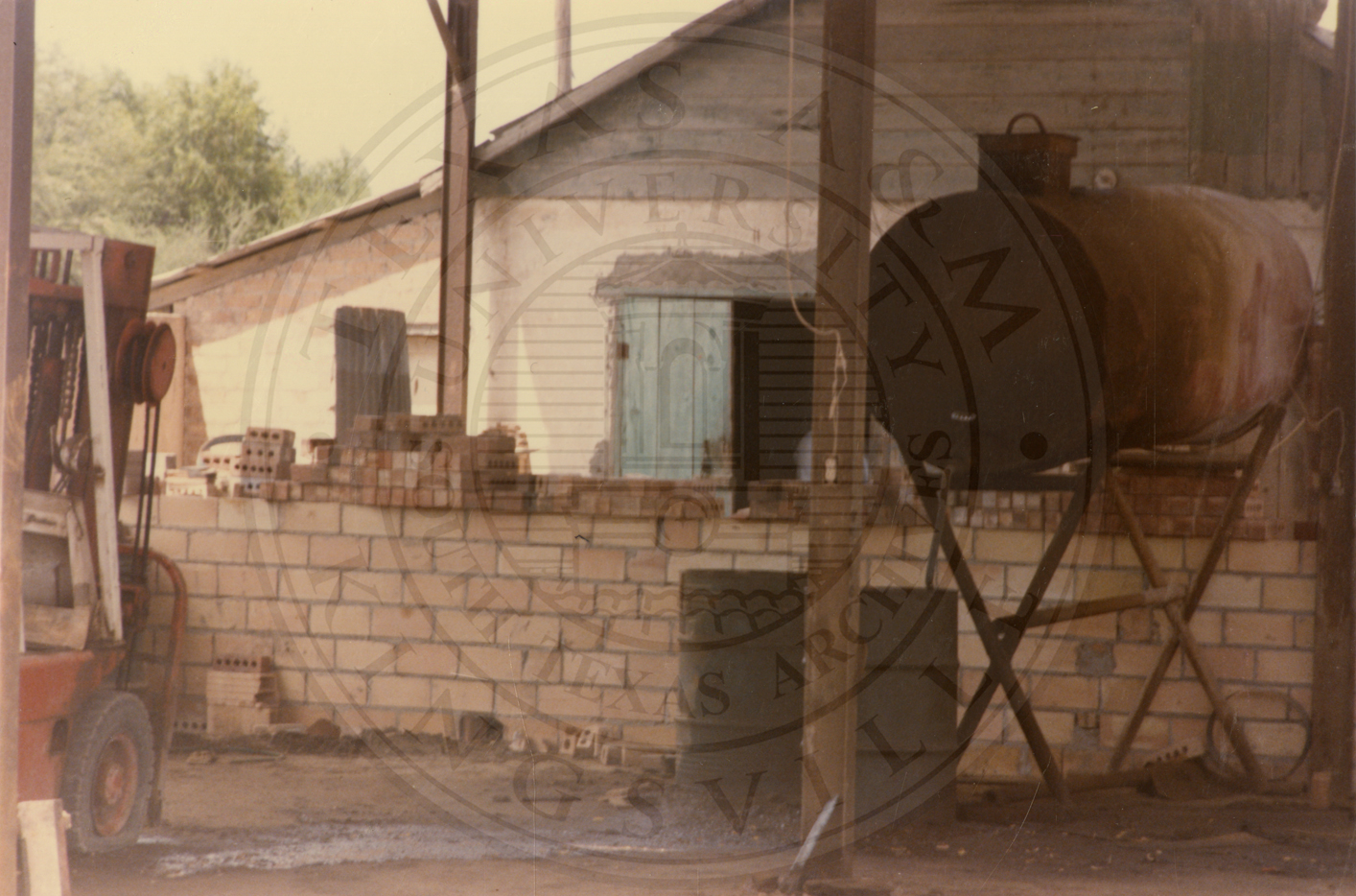 Work area at Carmago Brick. A forklift, and three barrels are seen under a roof. Two unidentified men walking behind the work area |