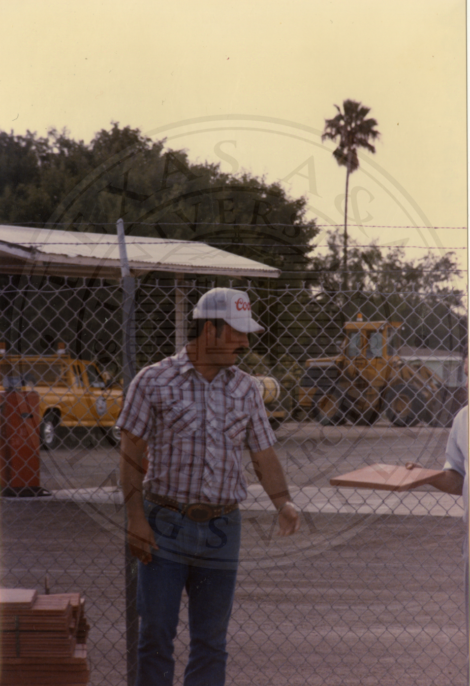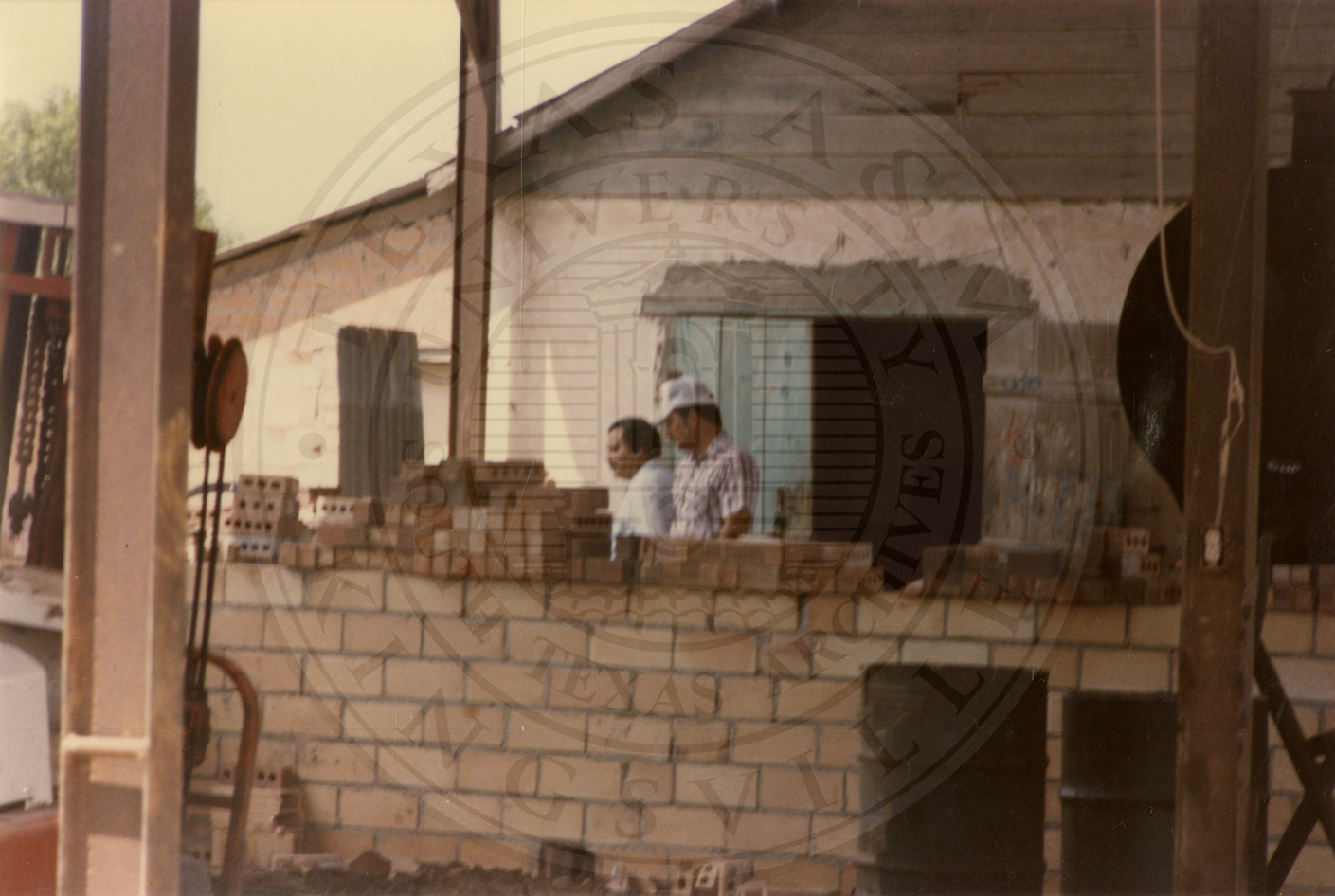 Two unidentified men standing in front of piles of cinder blocks. The man on the left is wearing a Coors hat |