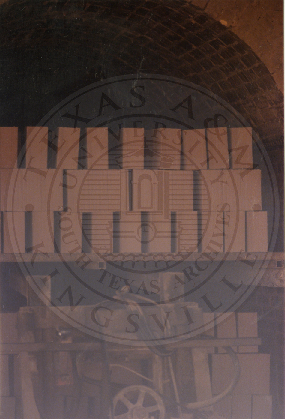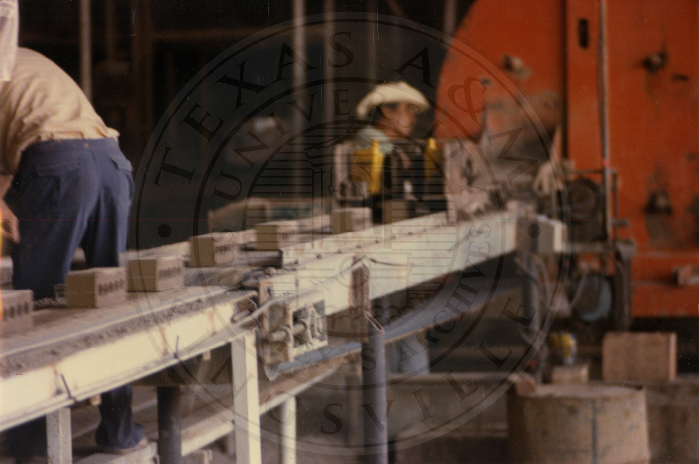 Two unidentified men working next to a conveyor belt with bricks on it from Camargo Brick