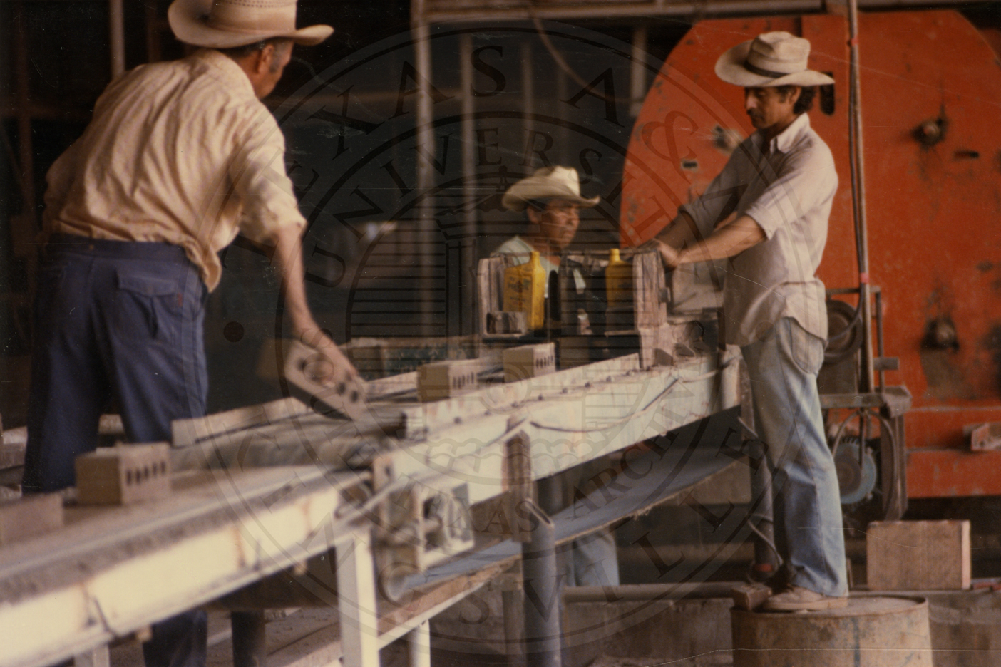 Three unidentified men working next to a conveyor belt with bricks on it from Camargo Brick