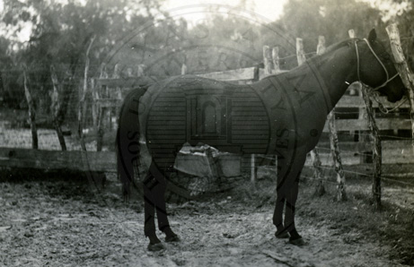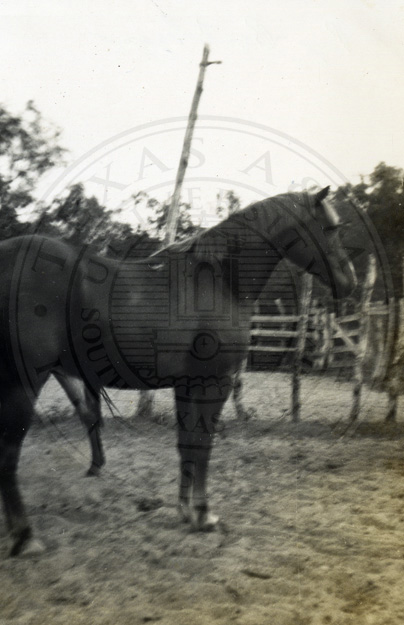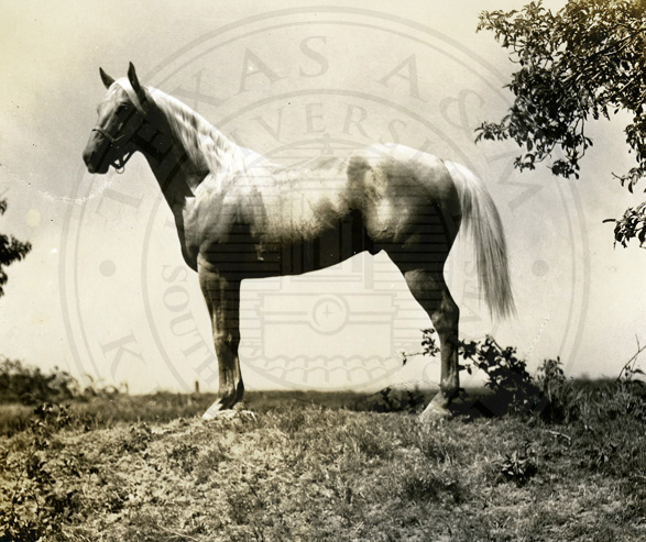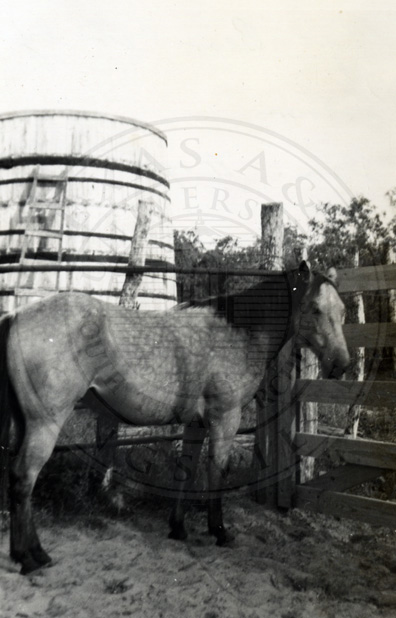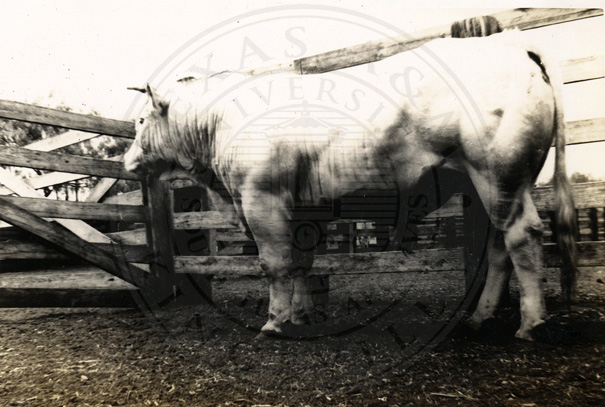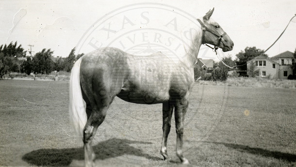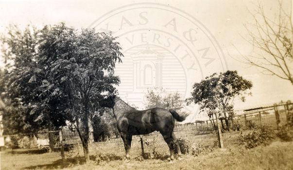 Horse in field standing by tree (article from Houston Post, Sunday Nov. 19, 1944 “Fine Quarter Horses Are a Northington Specialty” talks about quarter horses raised on William A. Northington’s ranch near Egypt, TX.