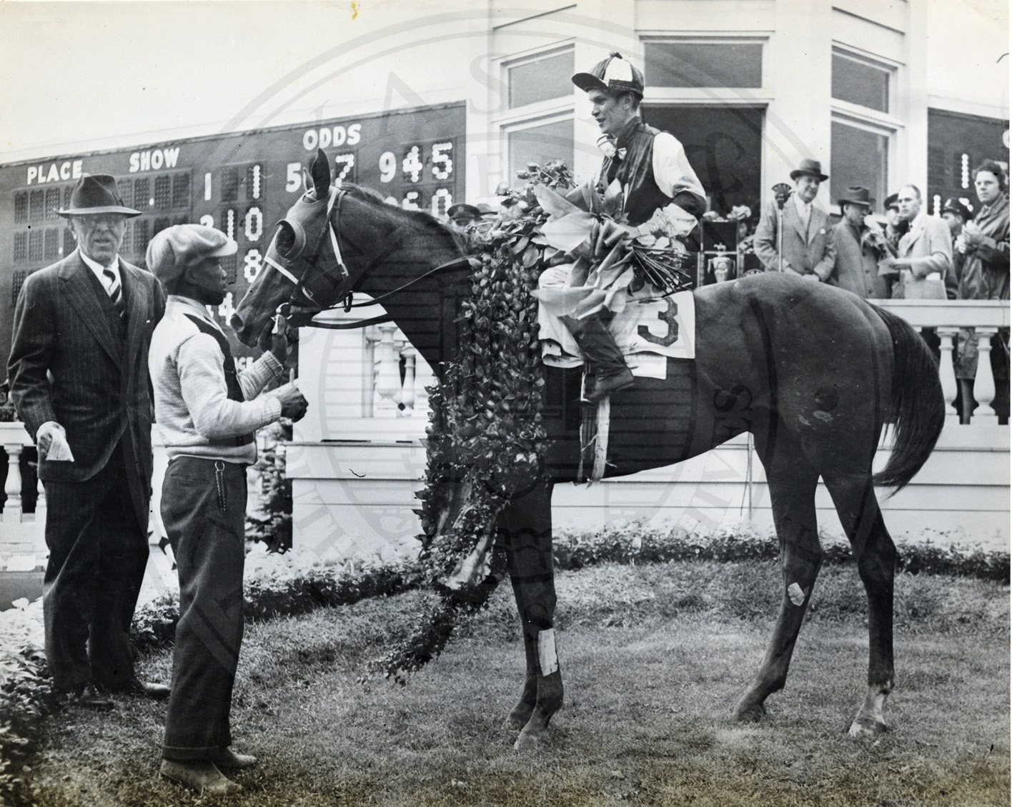 Unidentified horse sitting with winners wreath and jockey mounted. |