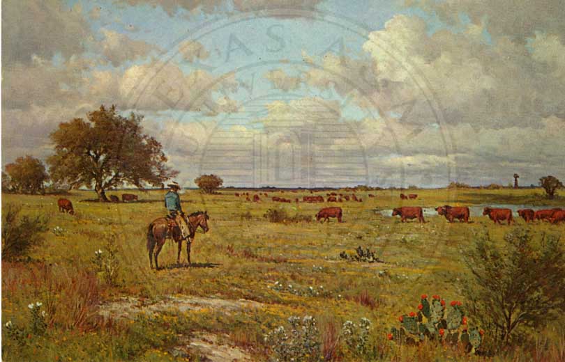 Post Card of a cowboy on a horse in a field with bulls |