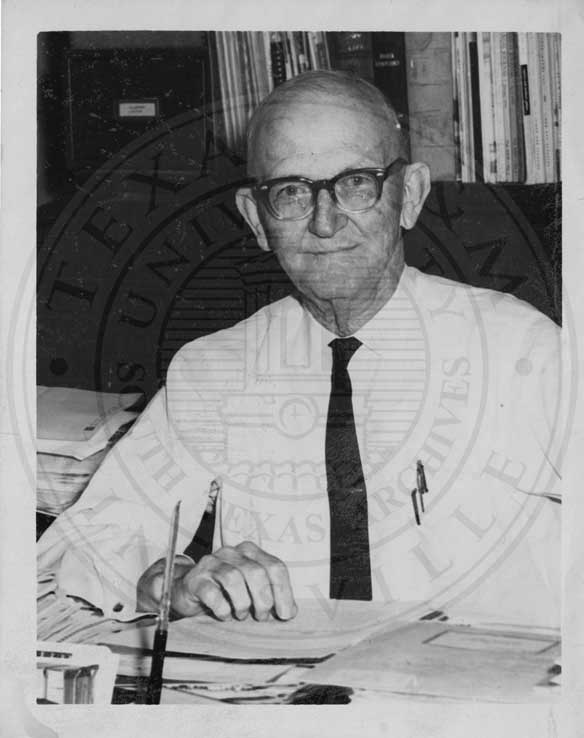 Picture of an older man dressed in a white button up with a tie and glasses sitting at a desk with multiple papers