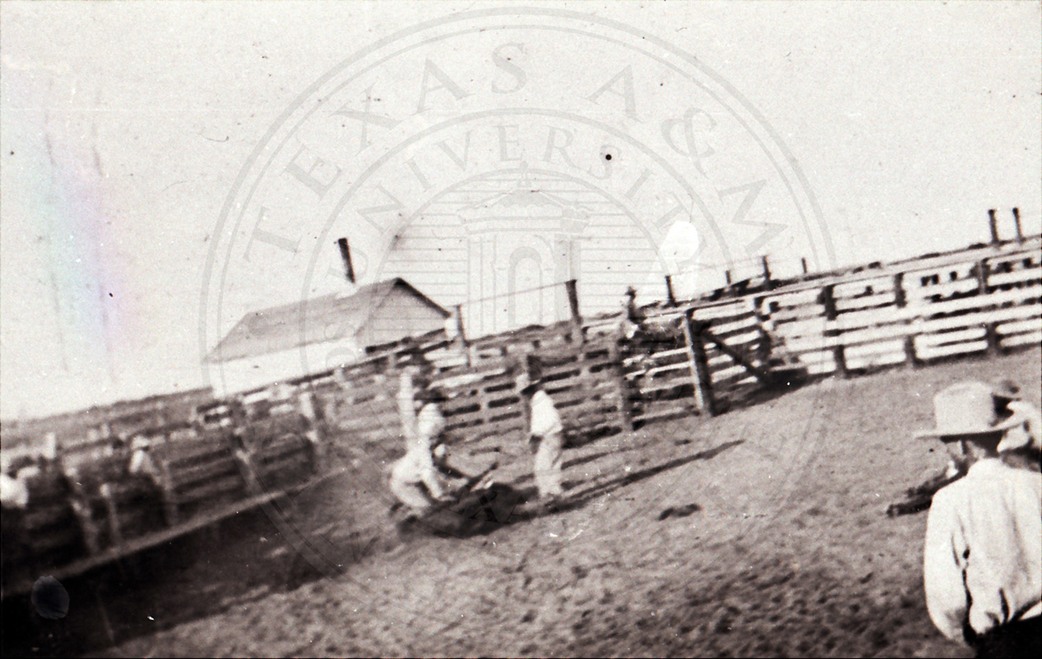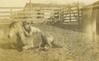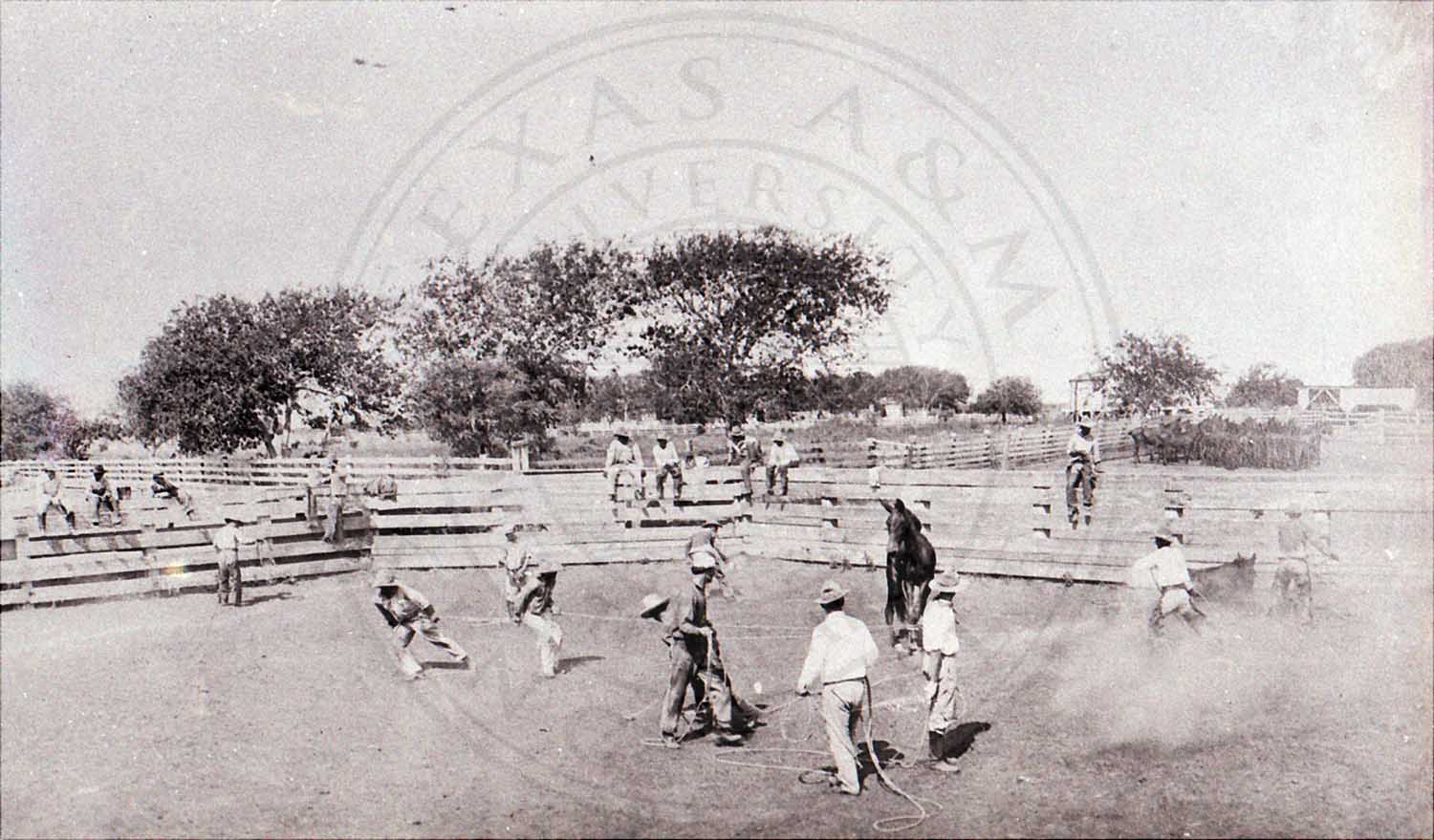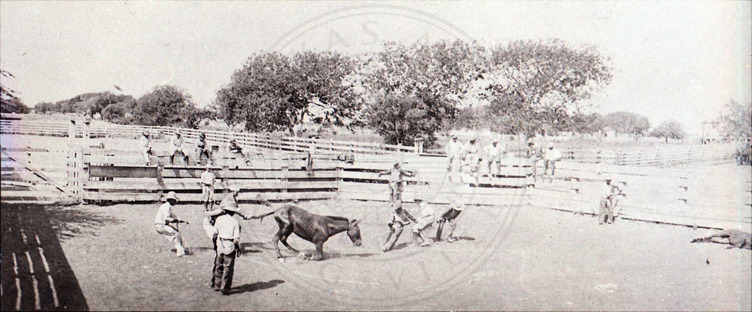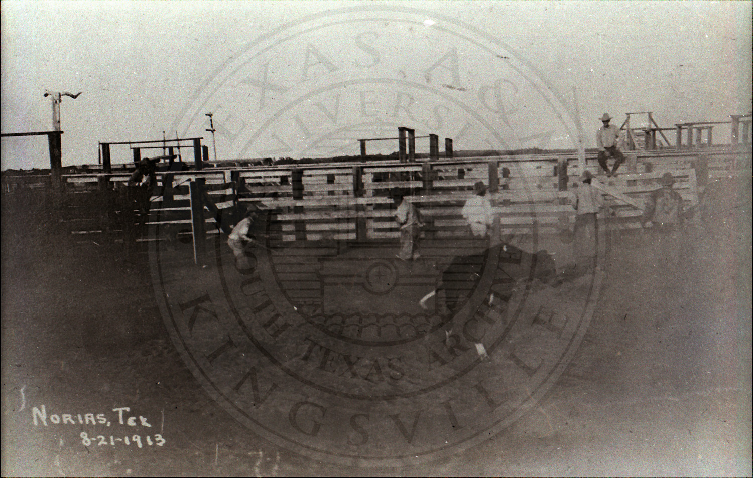Corral scene with cowboys breaking horses at the Norias. Ca 1915. |