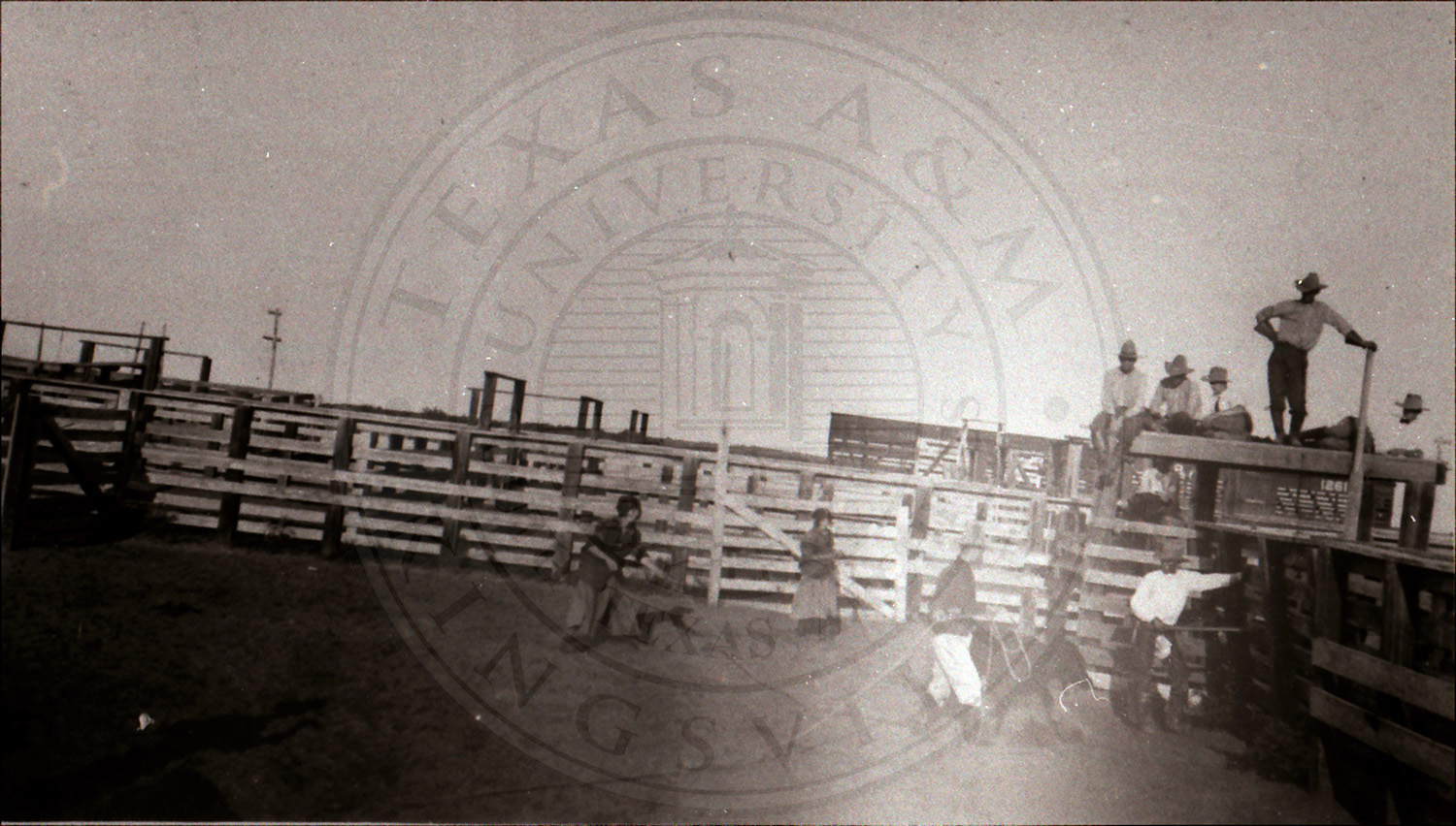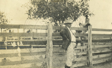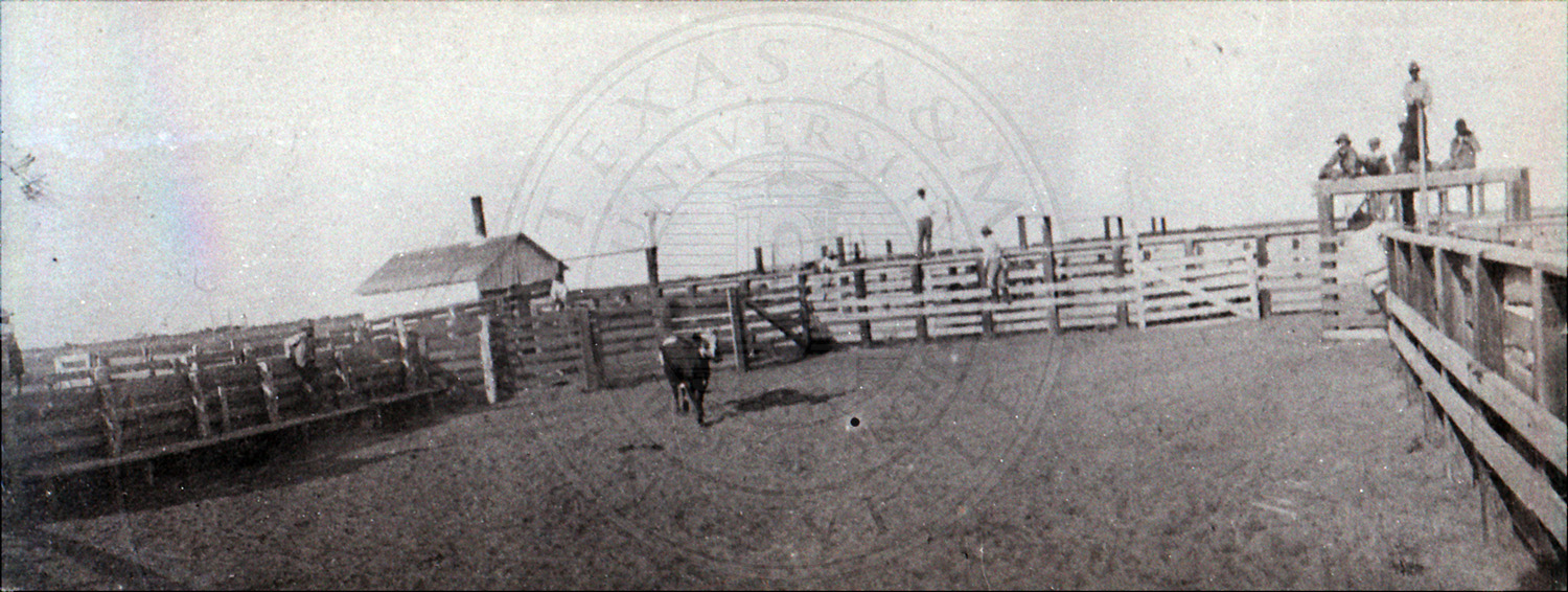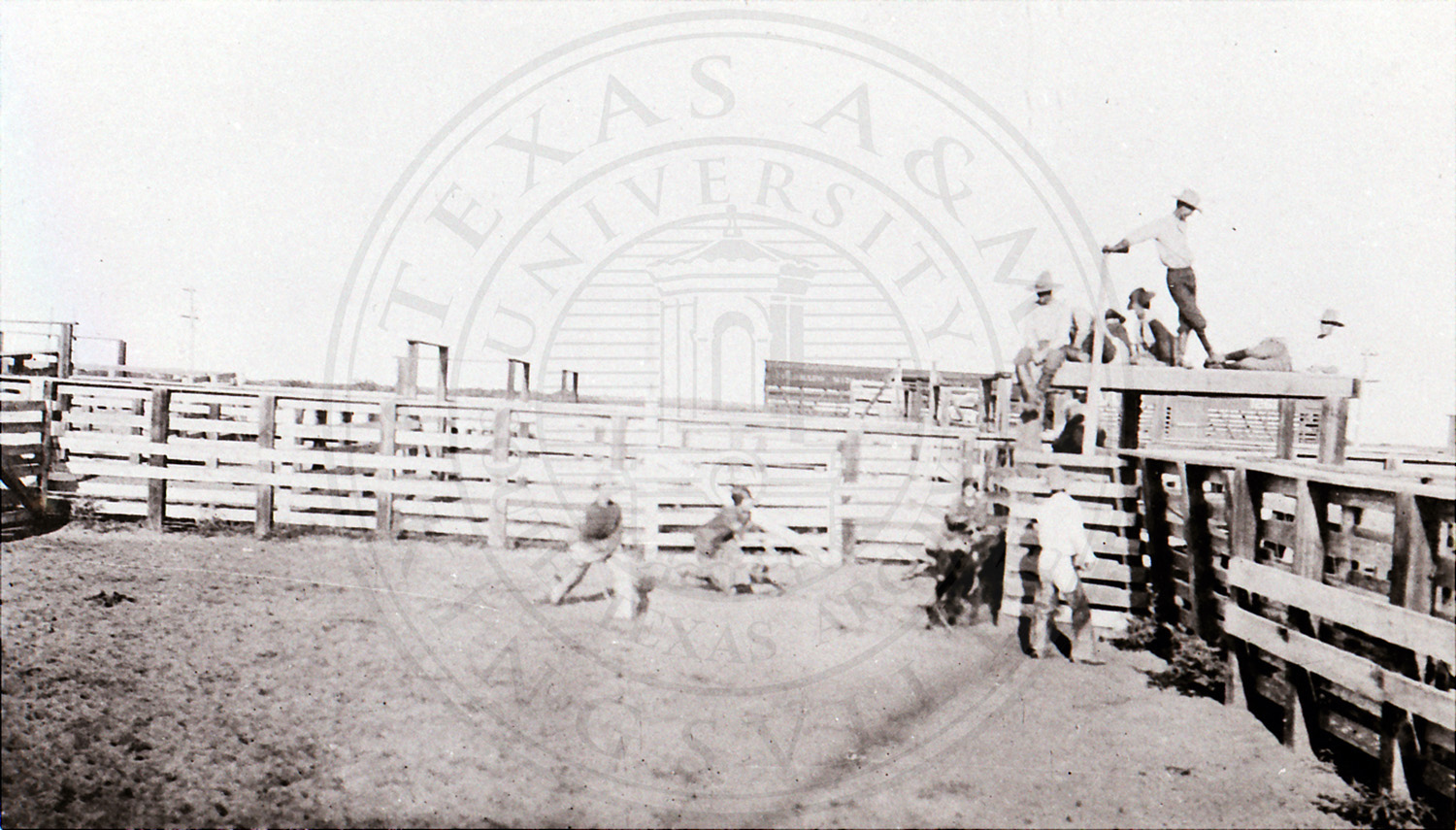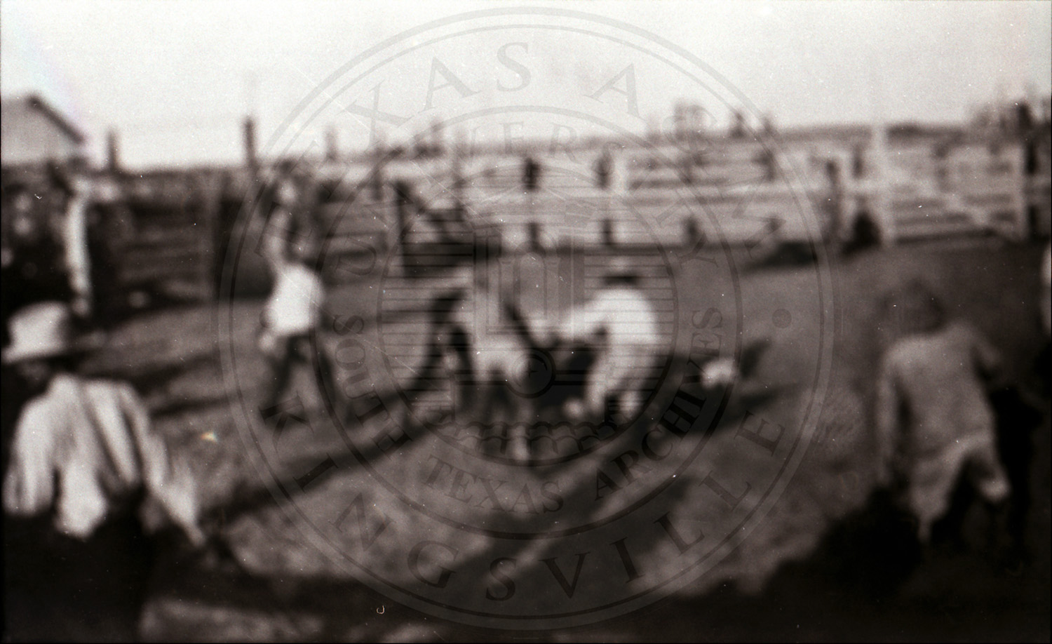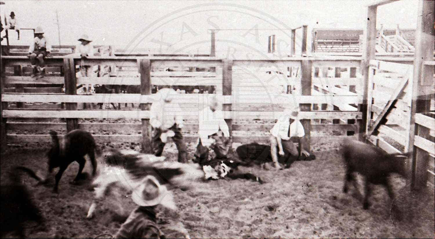 Corral scene with cowboys breaking horses at the Norias. Ca 1915. |