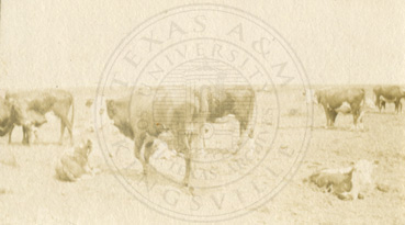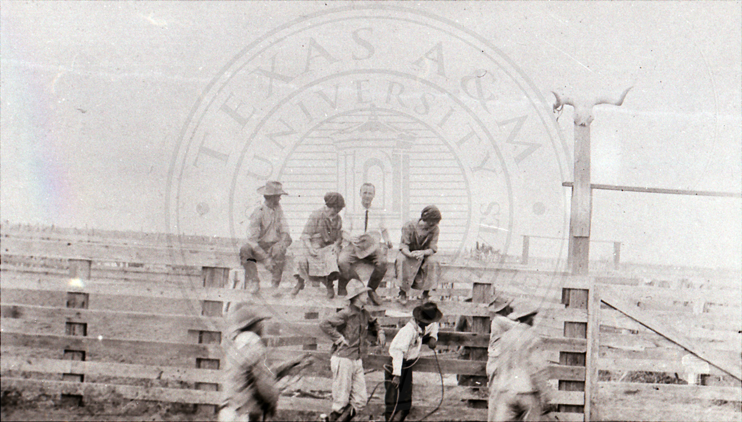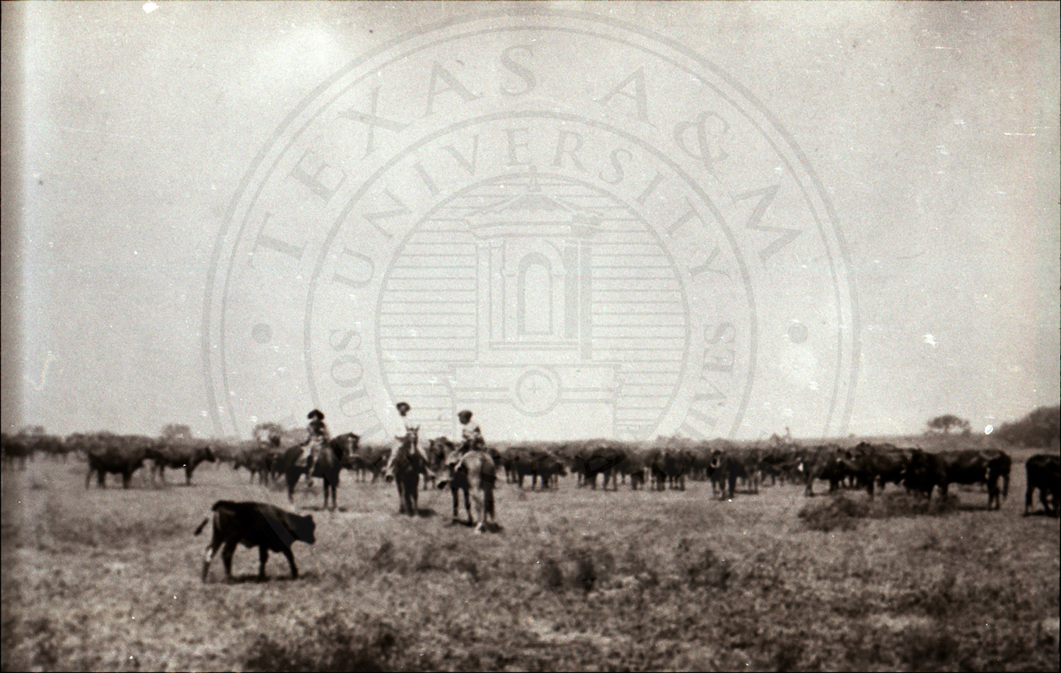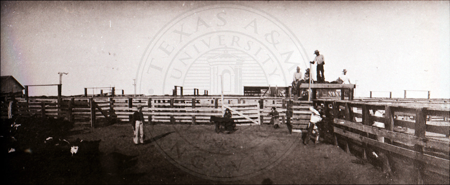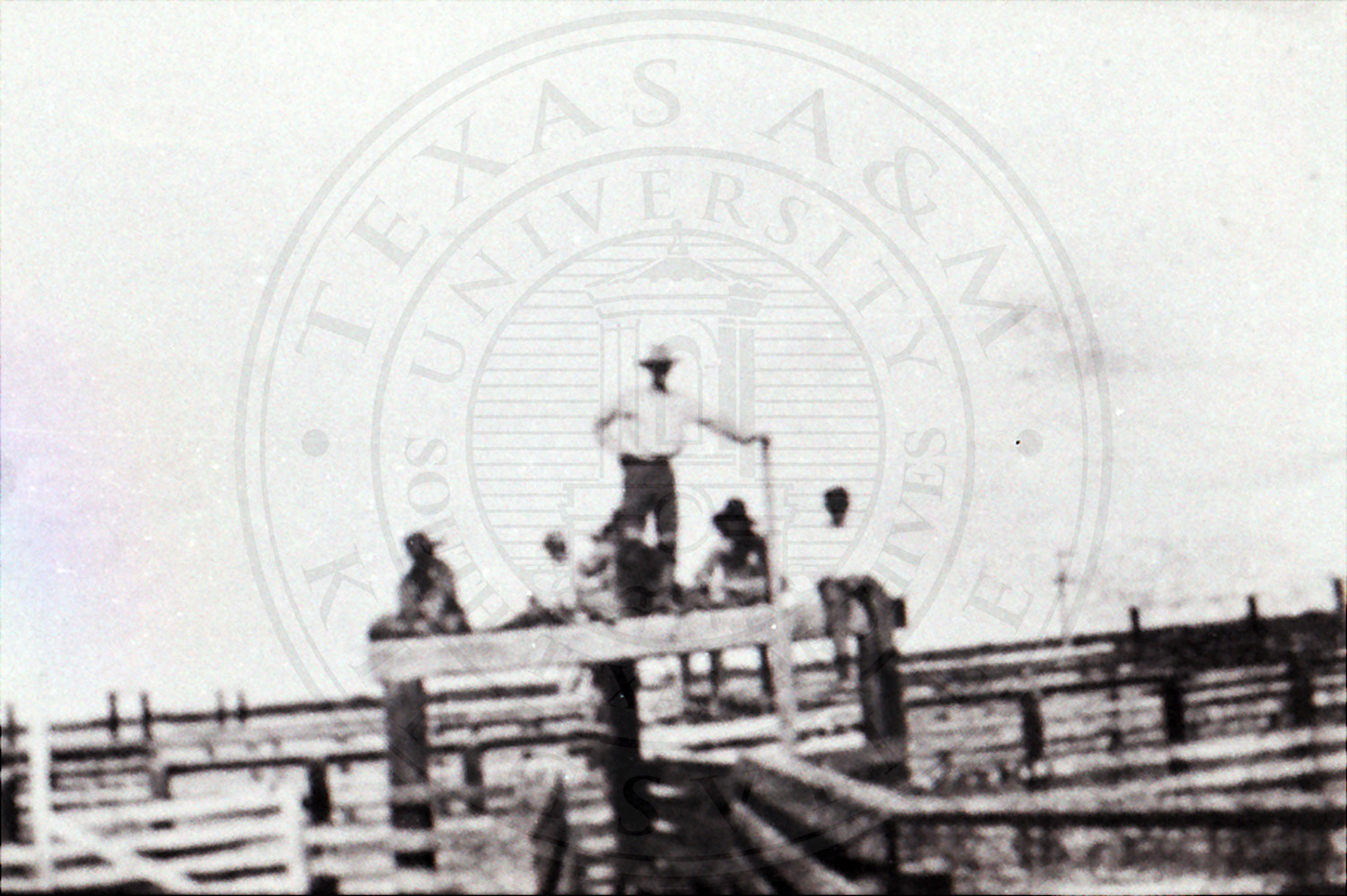 Four unidentified cowboys with cattle in corral at the Norias. |