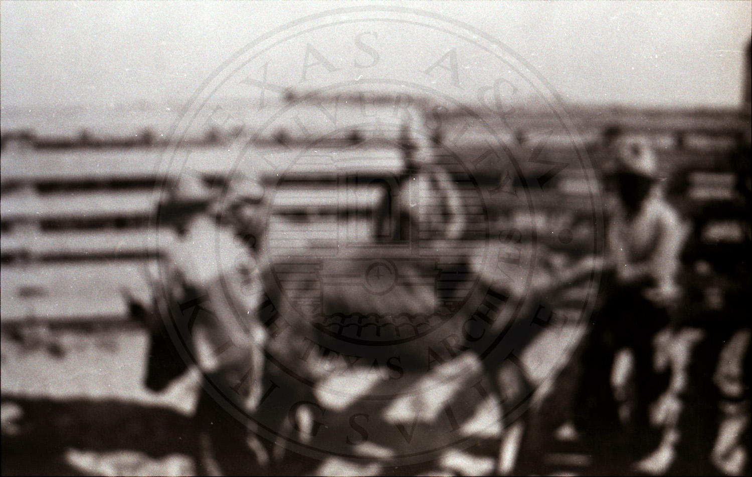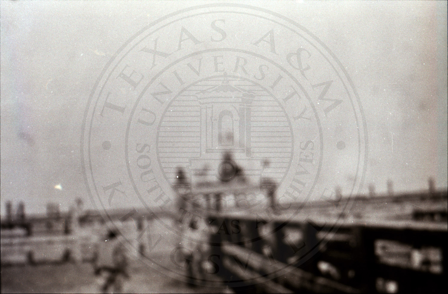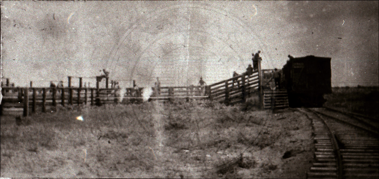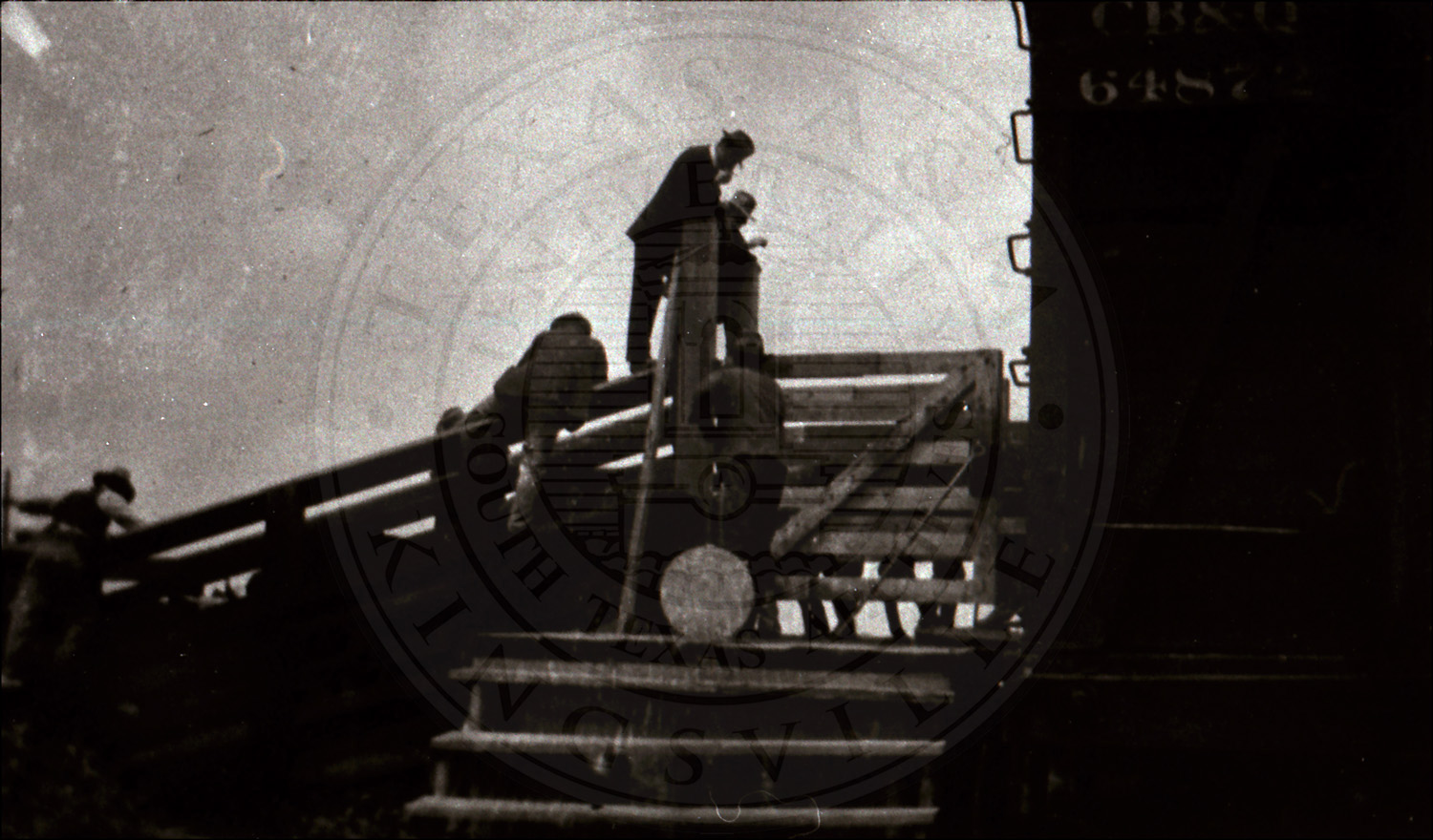 Cattle being loaded into cattle car through cattle chute at Norias. |
