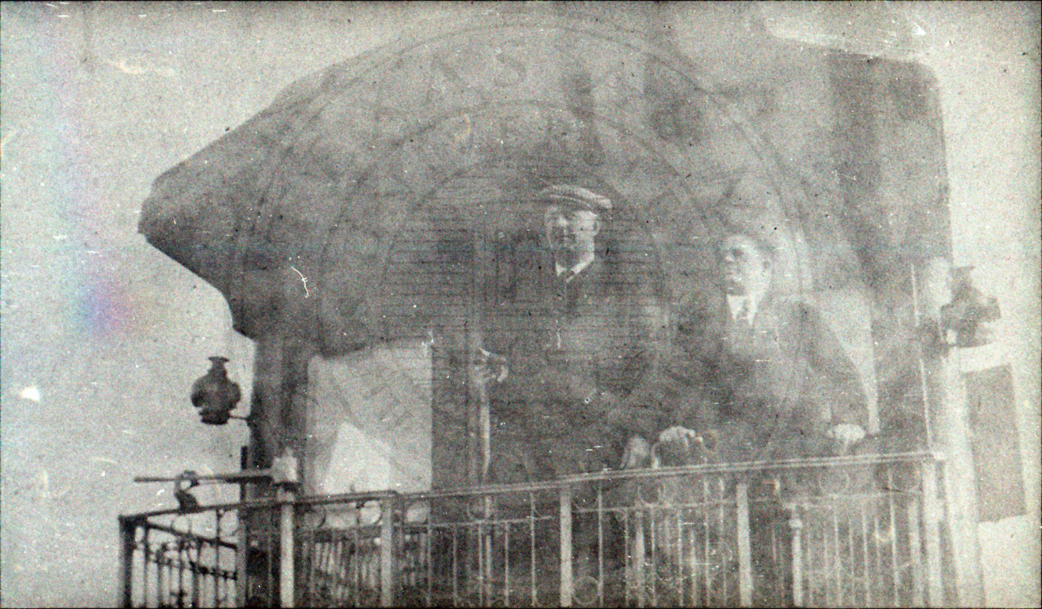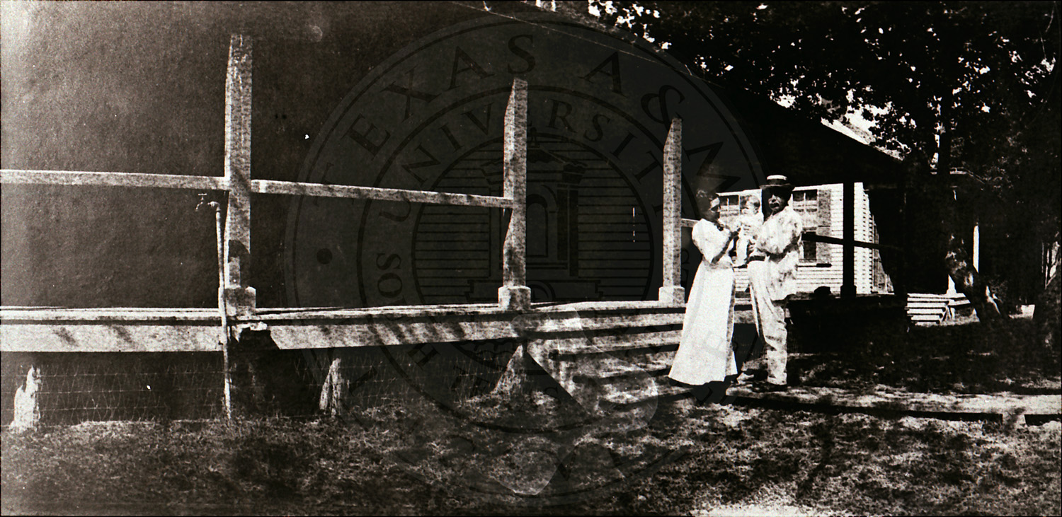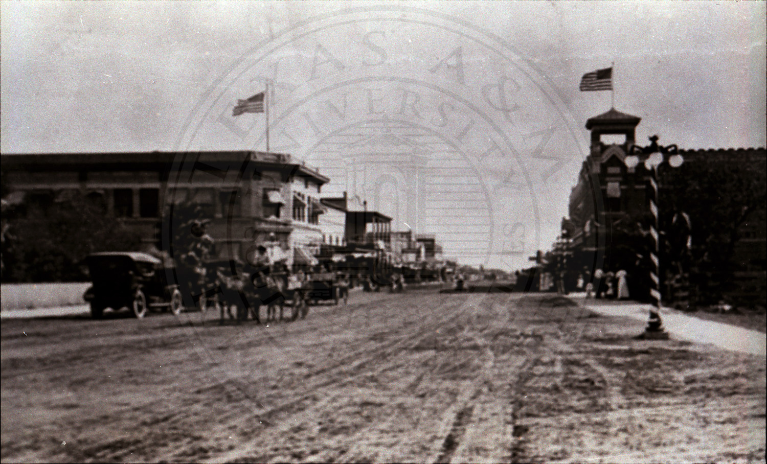 Kingsville street scene ca 1910. Standing in front of King's Inn, just west of 6th and Kleberg Ave. Can see Kleberg Bank and Raglands. Dirt streets and decorated lamp posts. |