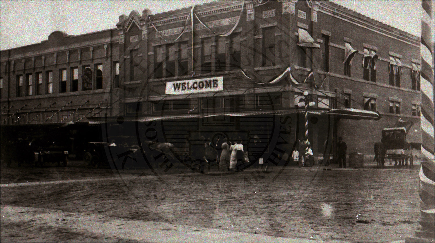 Raglands Mercantile and Flato Building on southeast corner of 6th and Kleberg Ave. in Kingsville. Ca 1910. Decorated lamp posts and "Welcome" sign on building. |