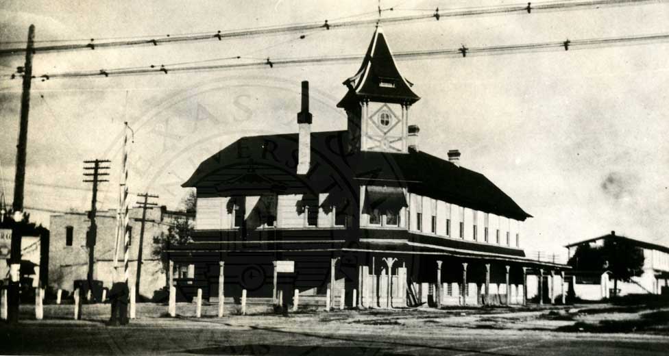 San Antonio & Aransas Pass psgn depot front and freight depot at Right (1920's)