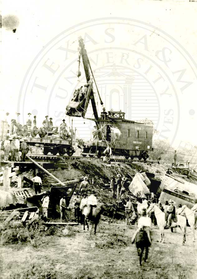 San Antonio & Aransas Pass Railroad line. San Antonio depot (1920) & engine. Also photo of first wrecker at work. (5 photos) |