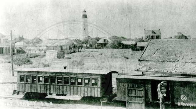 Rio Grande Ry Motor Car #1 and Coach in front of Point Isabel Depot in 1918. Note Light House in Background." |