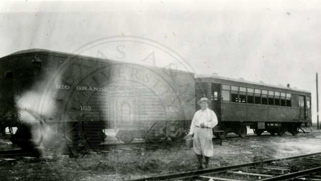 Rio Grande Ry Motor Car no. 1 and Coach at Point Isabel Depot in 1918" |