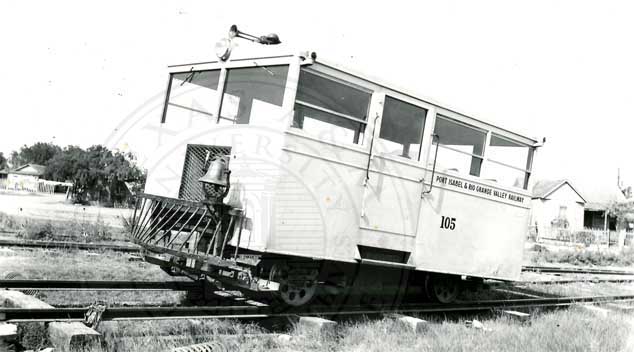 Pt. I. & R. G. V. Ry Motor Car 105 used for psg. mail & Express between Brownsville & Pt. Isabel - April 20, 1940." |