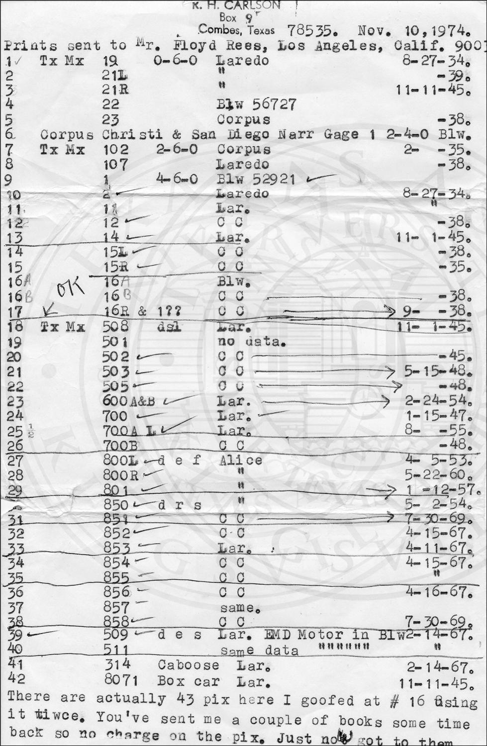 List of prints sent to Floyd Rees including railroad, number, locomotive wheel configuration