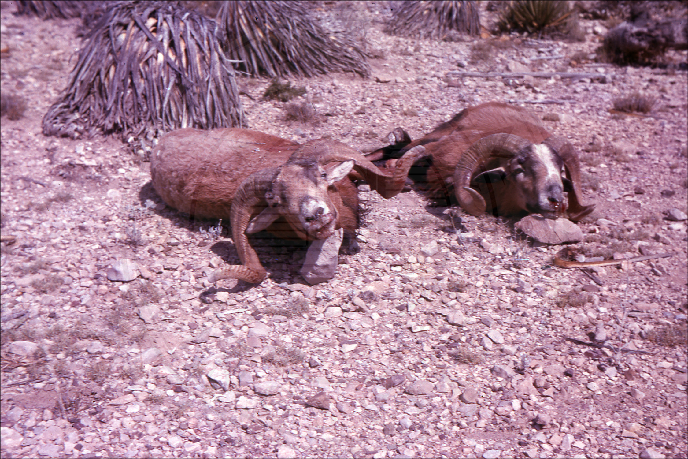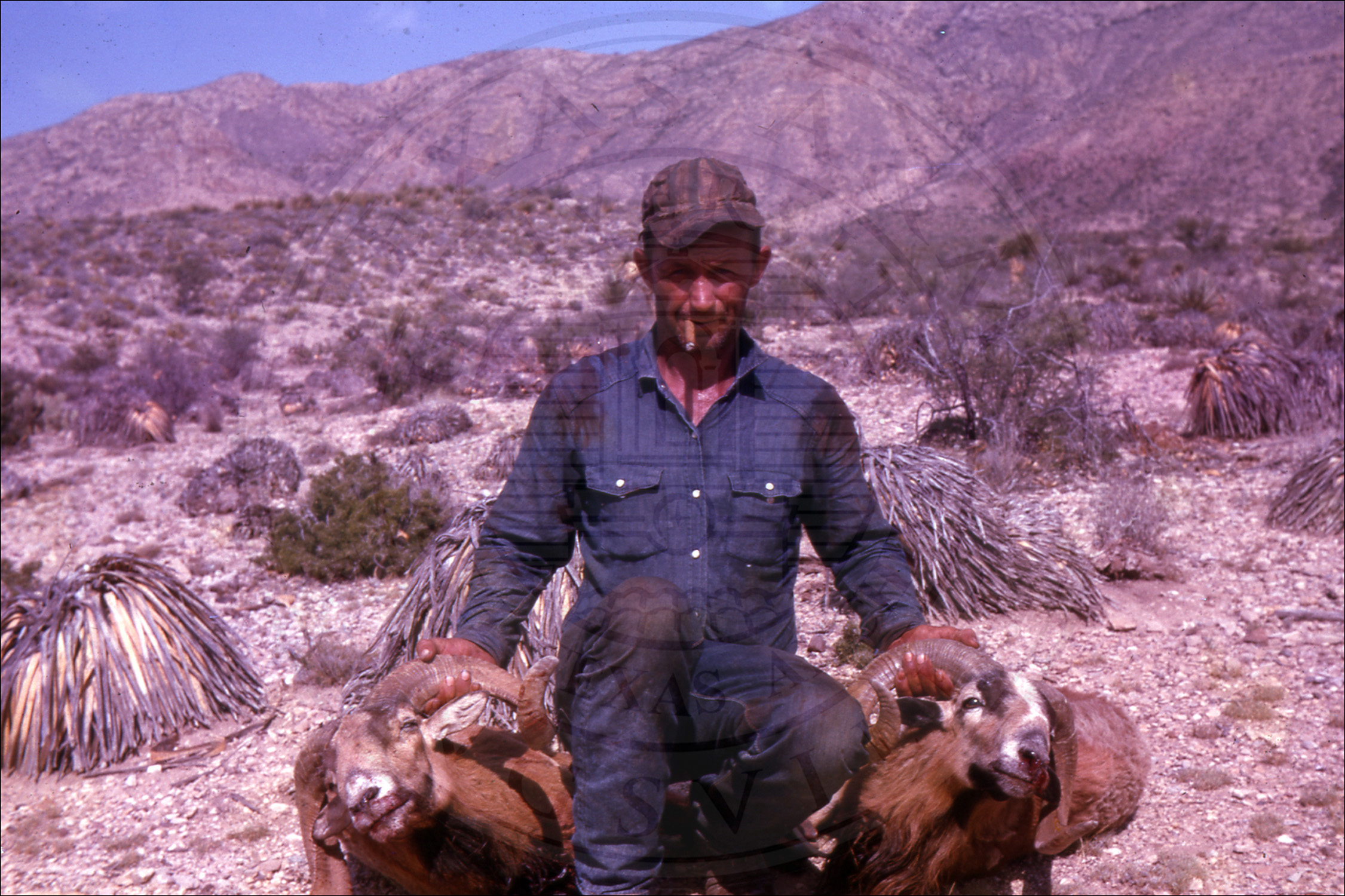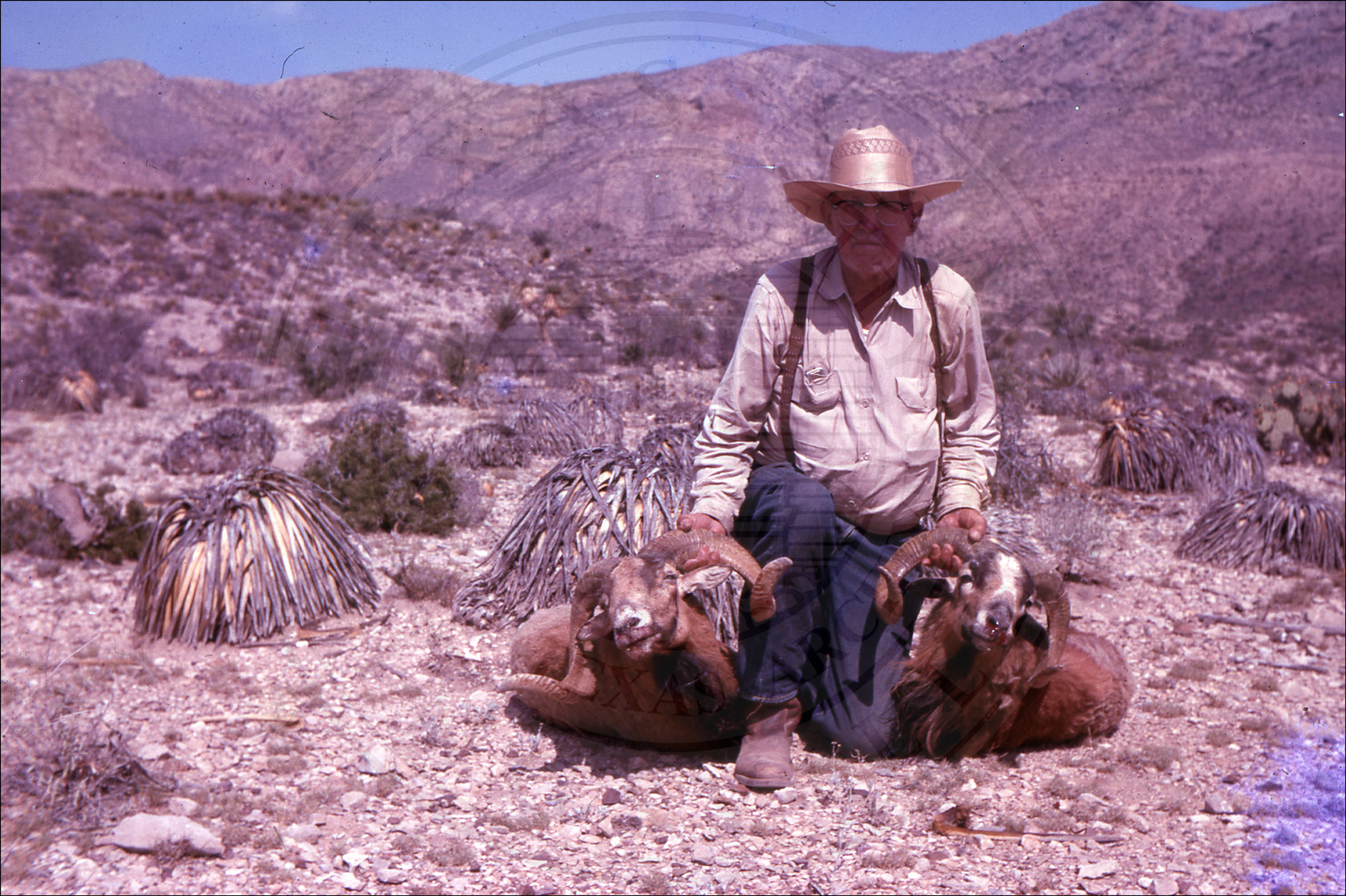 Hunting trip two longhorn sheep with unidentified man |
