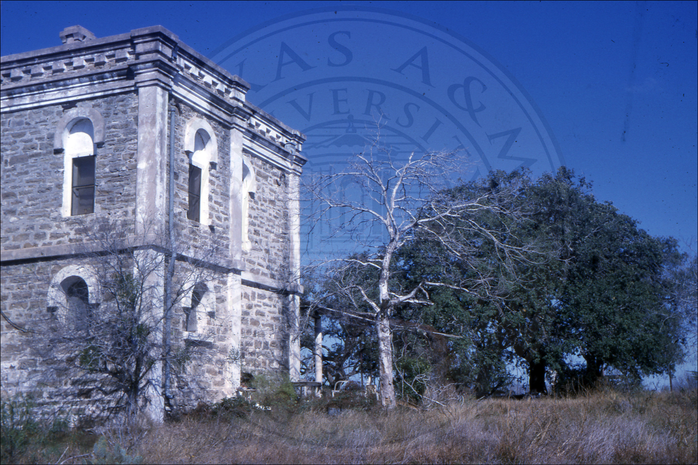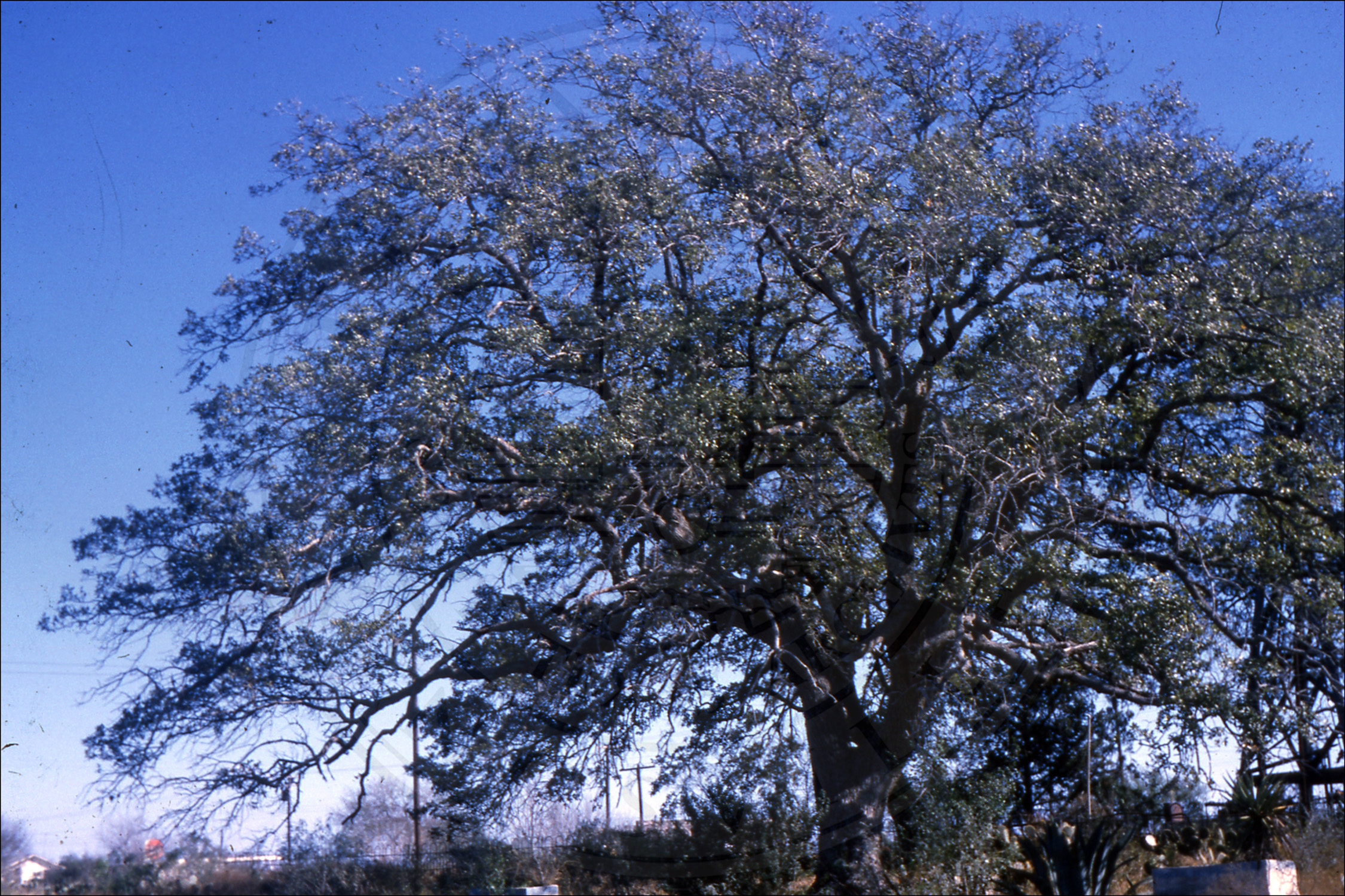 Live oak with oil derrick, possibly in Oakville, Texas |