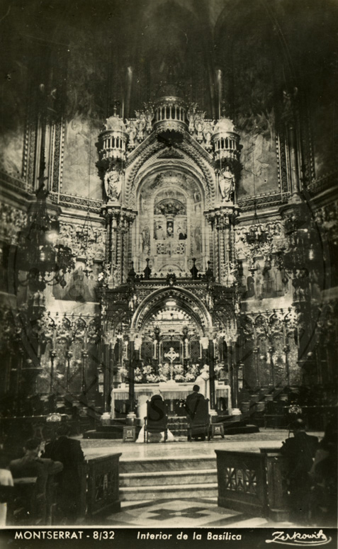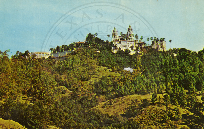 Heast Castle stands on the Enchanted Hill, a spur of the Santa Lucia Mountains. This view from Scenic Highway I, Shows the summit at an elevation of 1800 ft., crowned with the gleaming buildings and towers.