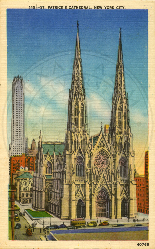 St. Patrick's Cathedral, New York City. St. Patrick's Cathedral is located on Fifth Avenue at the corner of 50th street. It is the leading Catholic Church in New York City and one of the grandest cathedrals in the world. One of the most interesting features of this great thoroughfare.