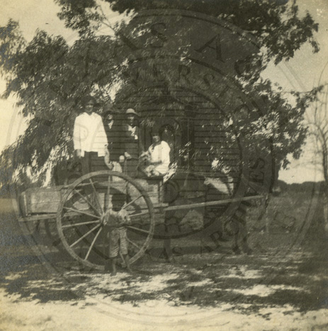 Photo of ranch land. Four unidentified children. Three standing on top of carriage and one standing beside wheel.