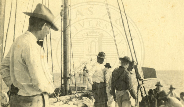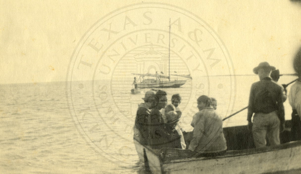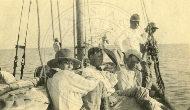 Photo of five unidentified men and a woman wearing hats inside a boat.