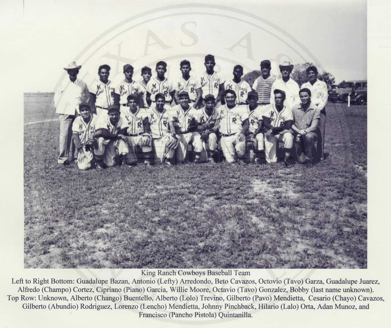 King Ranch Cowboys Baseball Team. Top row, far right is Francisco Pancho Pistola Quintanilla, father of Cynthia Quintanilla. |