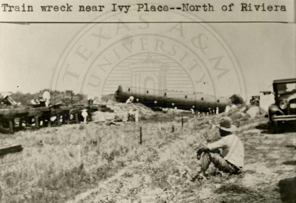 Train wreck near Ivy place north of Riviera, TX; photo of downtown Riviera and of its train depot. (early 20th century); photos of train wreck at Tandy Station, of Brownsville, in Oct. 1915 at which Engineer Kendell Killed. (17 photos) |