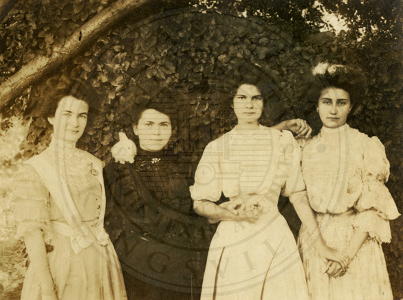 Postcard of four unidentified women. Three women wearing a white dress, one wearing a black dress.