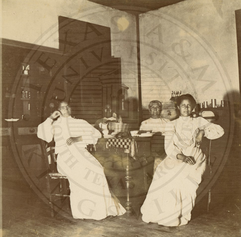 Photo of inside a house, probably kitchen. Three unknown women and one unknown man.