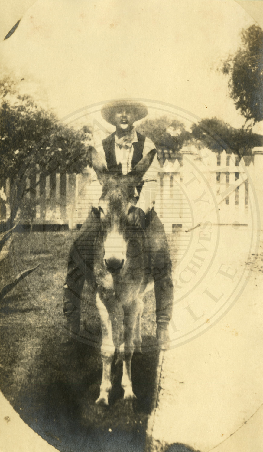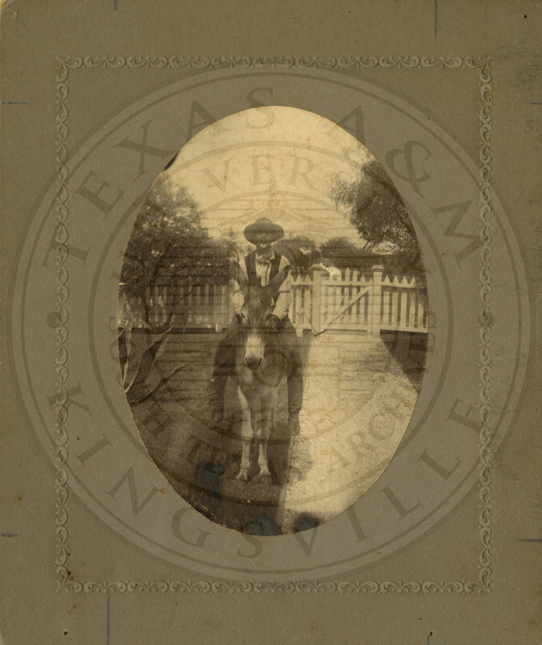 Photo of unidentified boy riding a donkey. Boy wearing a black vest and hat.