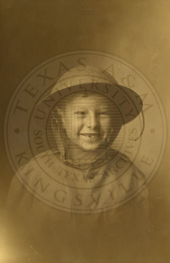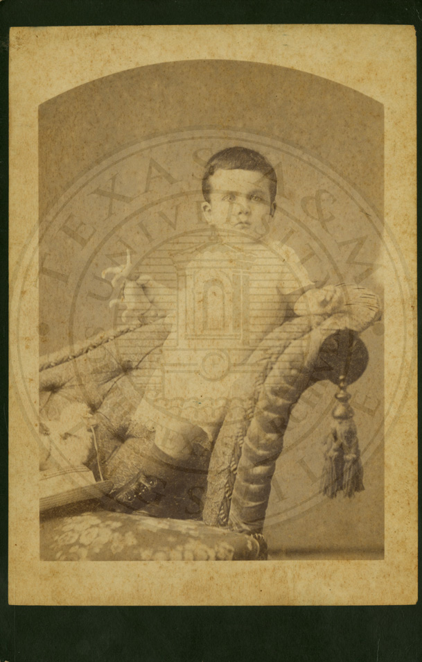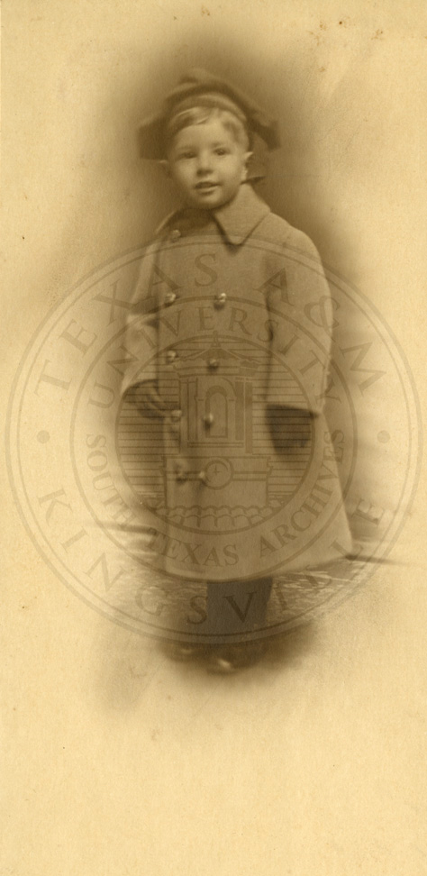 Photo of unidentified boy wearing a long coat, hat, and gloves.