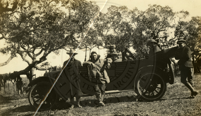 Picture of five unidentified men. Three standing next to car, two inside car.