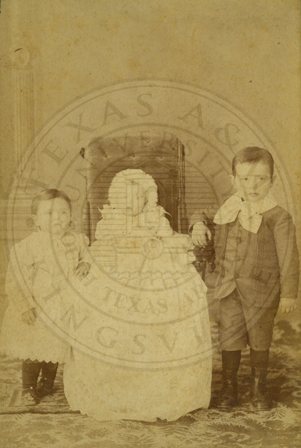 Three unidentified children. Two girls wearing white dresses; one sitting one standing next to her. Another boy next to girl standing.