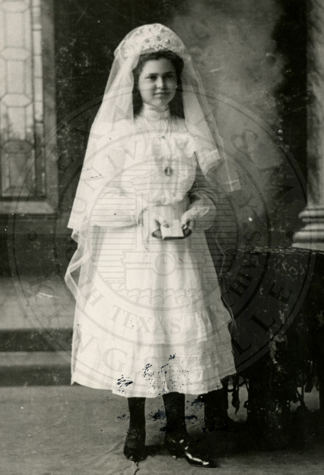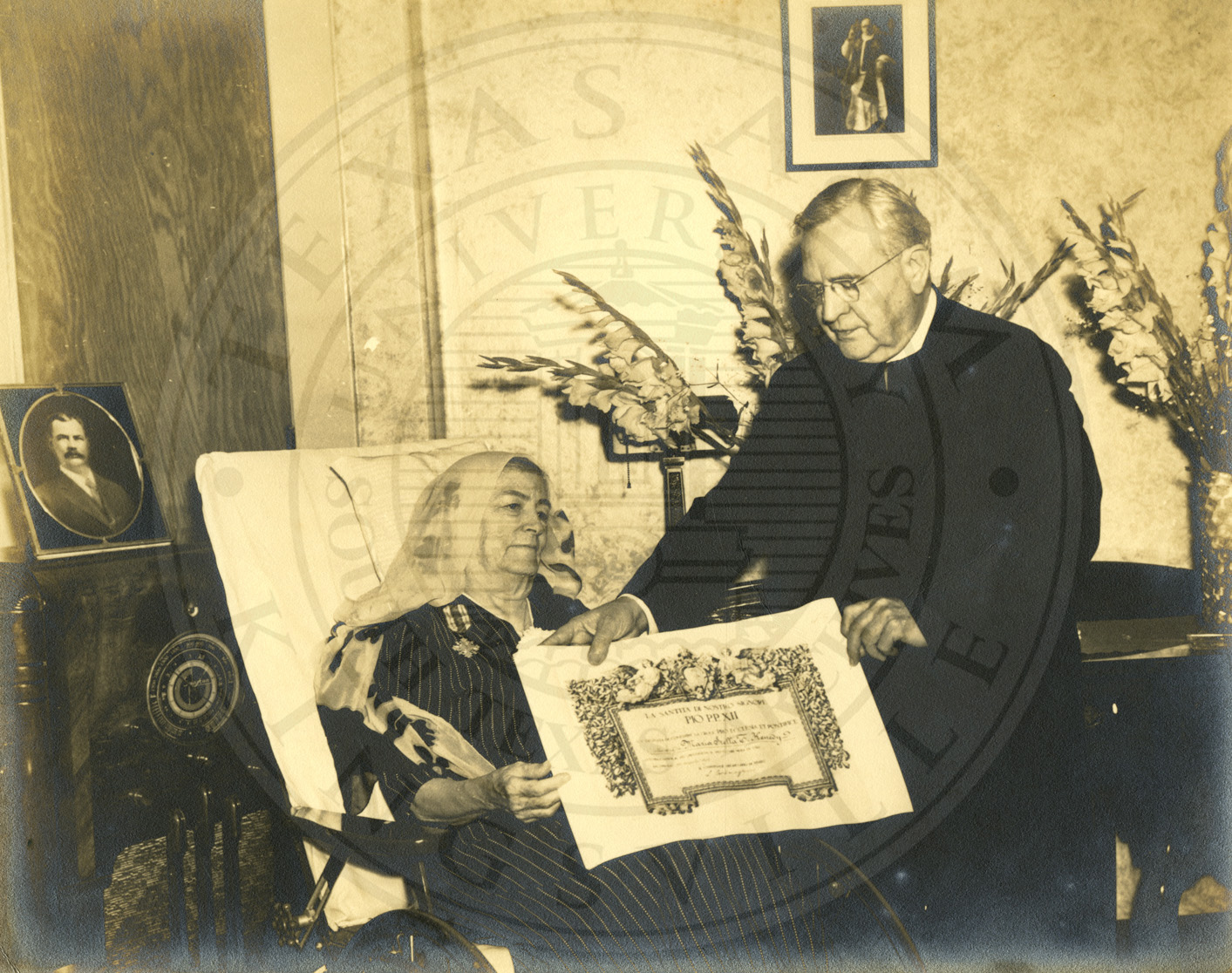 Unknown priest holding a diploma with Marie Stella Turcotte Kenedy