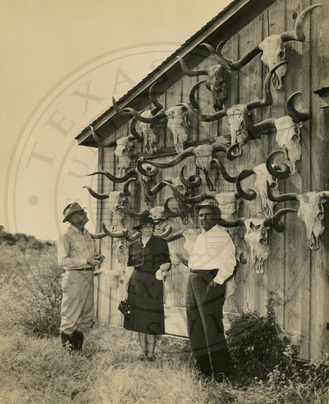 Longhorn skull collection, (L>R) unknown; Sarita Kenedy; John G. Kenedy, Jr.